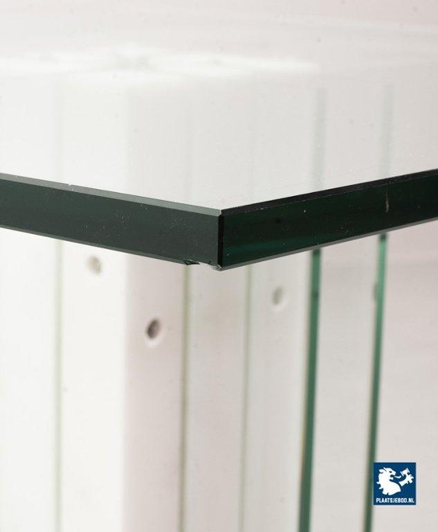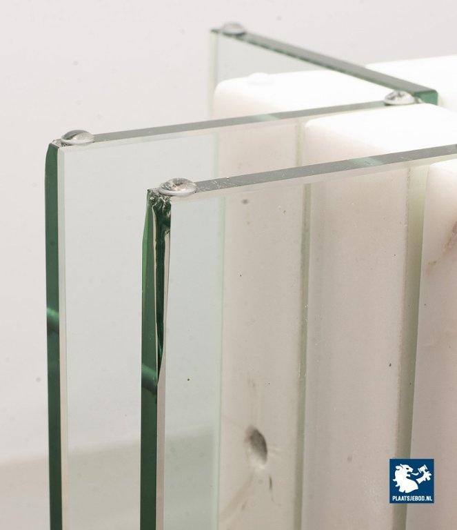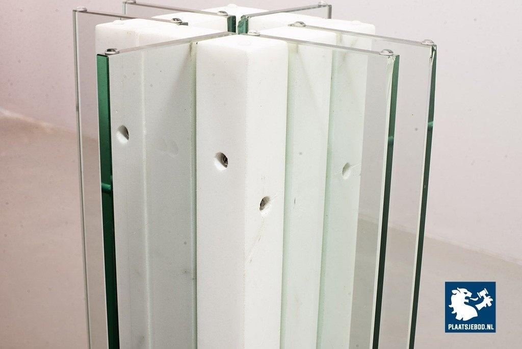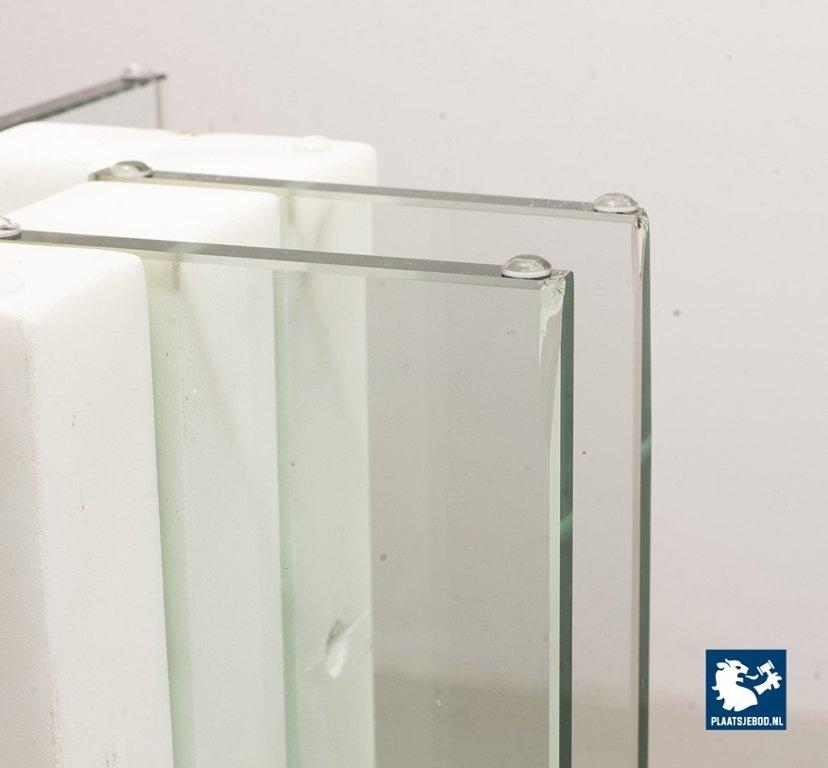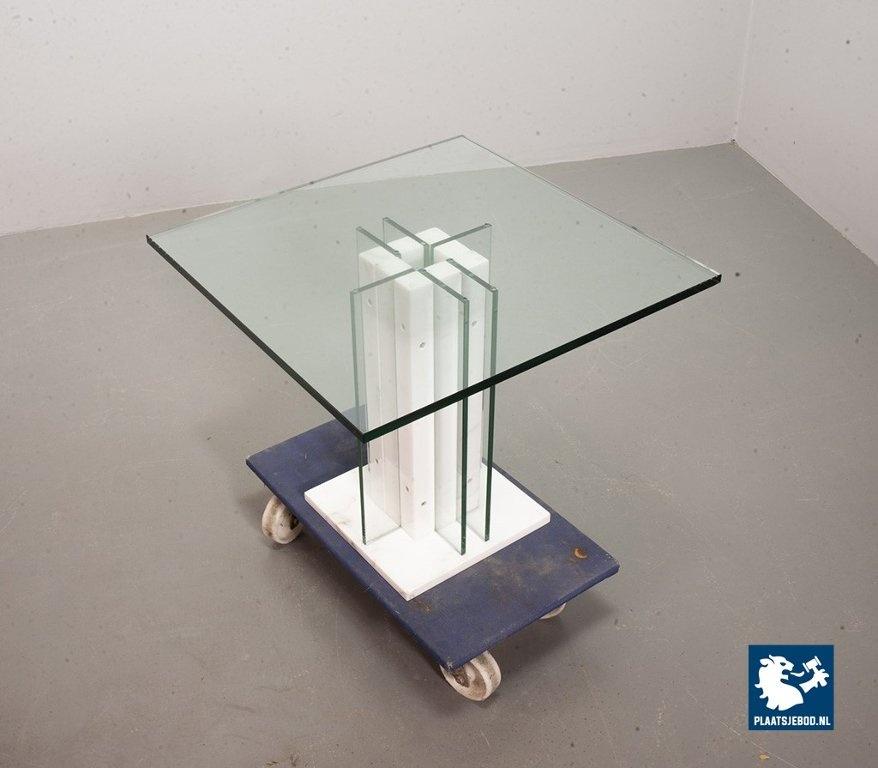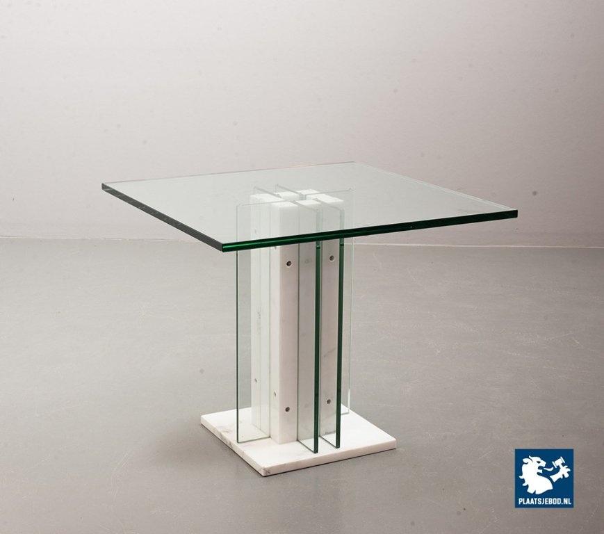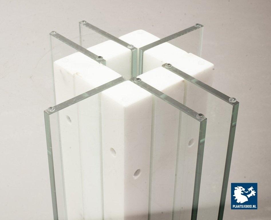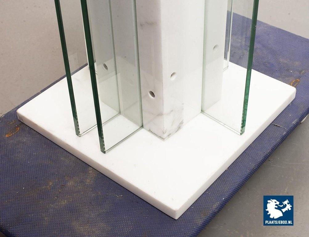 Italian Square Side Table on white marble and glass pedestal with thick glass top. This pedestal / side table features a lighting option within the pedestal in a way that the edges of the vertical glass parts of the pedestal are illuminated. This lighting option gives a special effect to the side table. The side table is in good condition with some non disturbing but visible wear on the edges of some glass parts. Wear is consistent its age and use. Dimensions: Height: 41 cm, Width: 60 cm, Depth: 60 cm, Quantity: 1