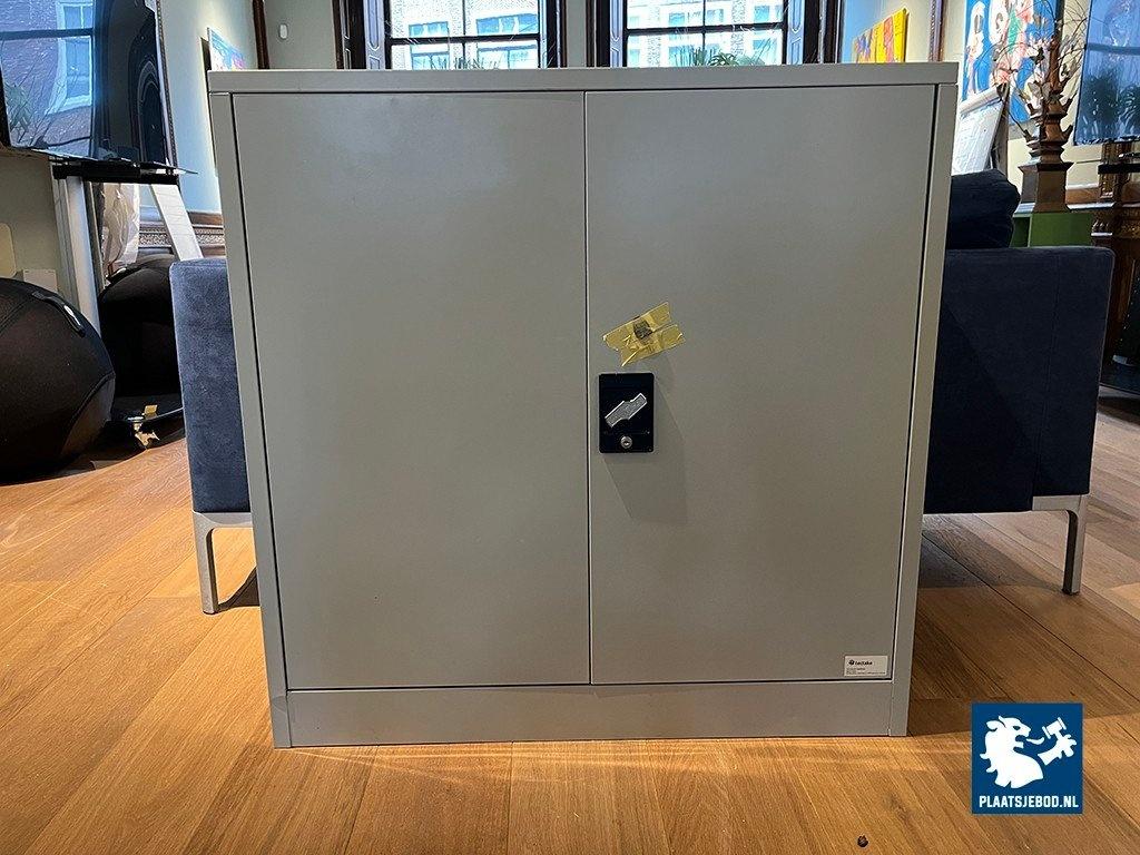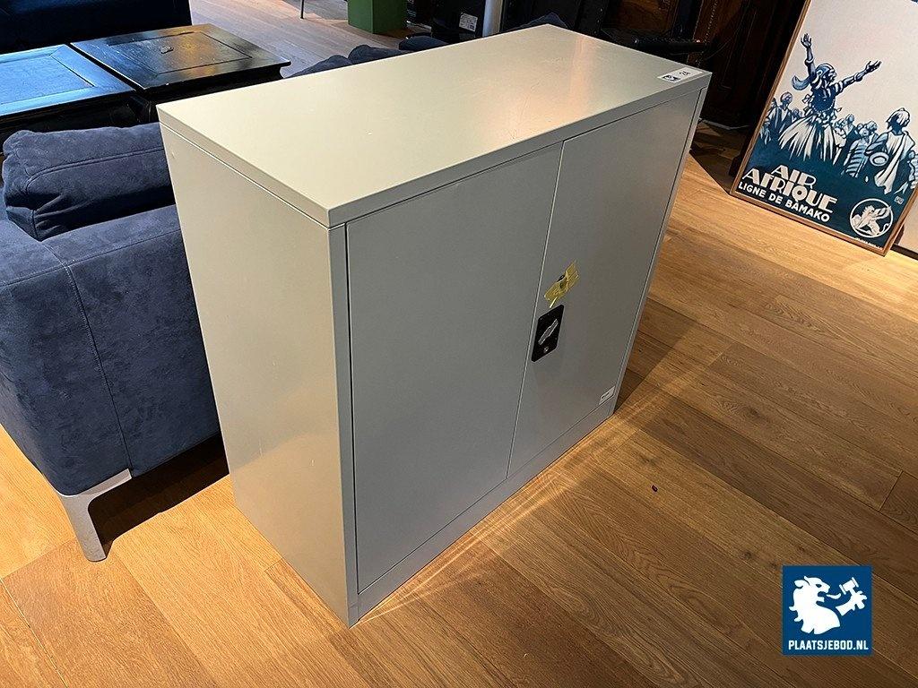 1 x 2-Deurs metalen archiefkast ca. 90 x 40 x 90 cm met divers kantoorgerief en 2 x poster