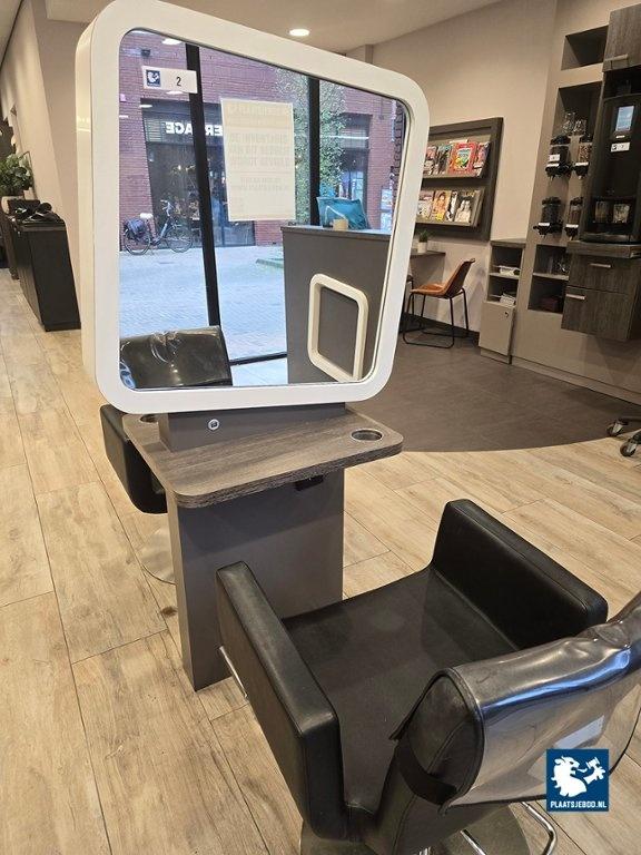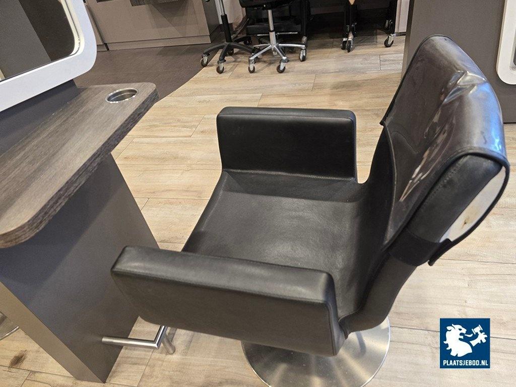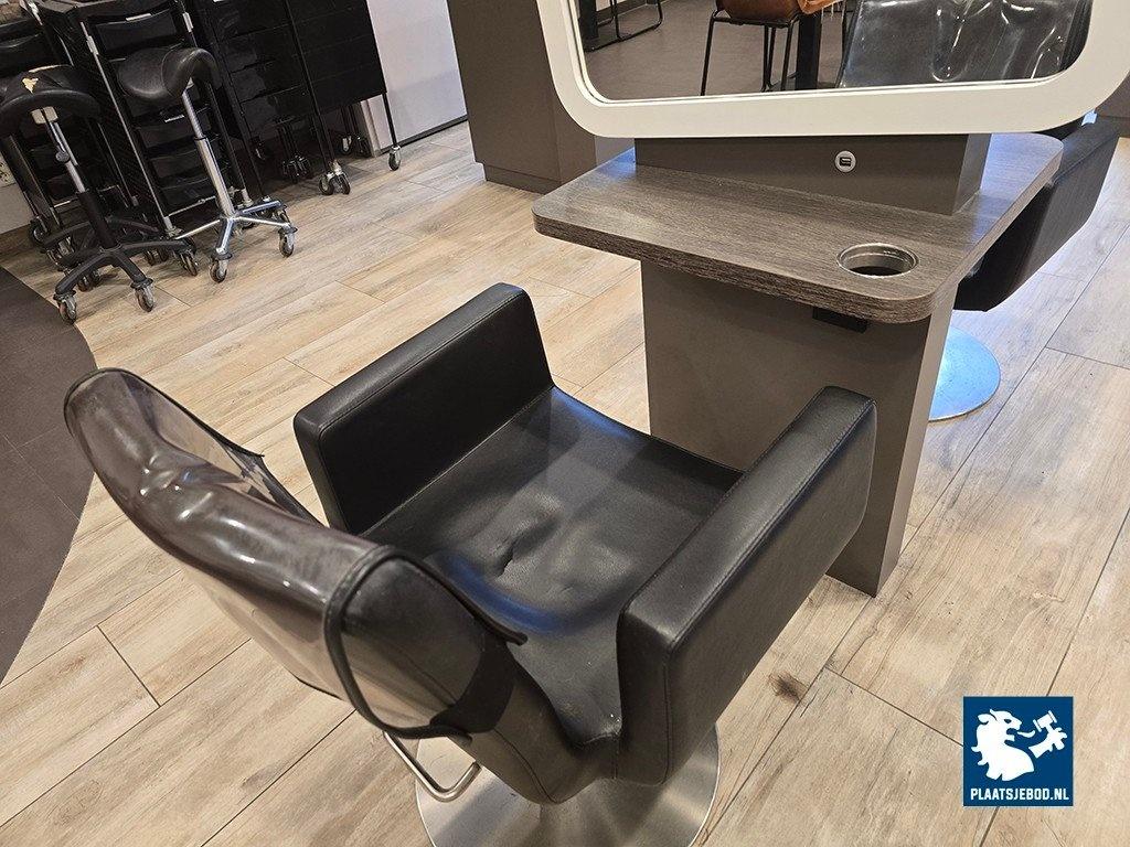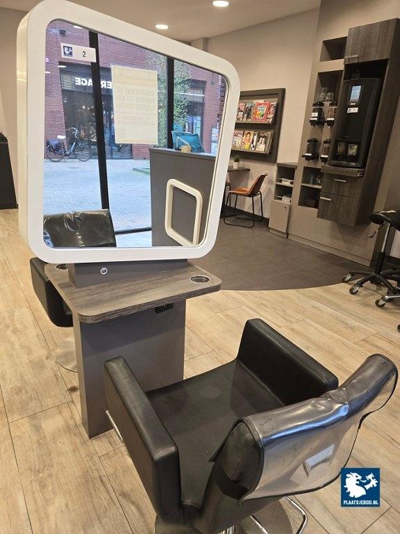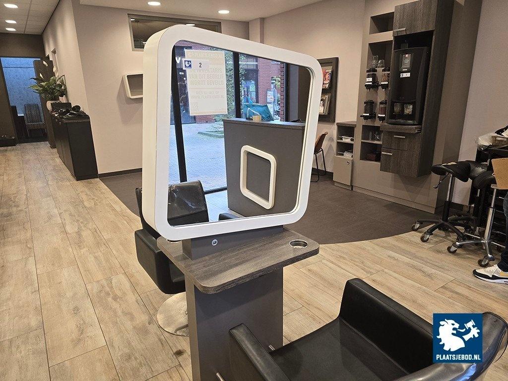 1 x 2-Zijdige kappersspiegel ca 80 x 57 x 170 cm voorzien van voetsteun, elektra en USB aansluiting, met 2 x hydraulisch voetbediende Sibel kappersstoel