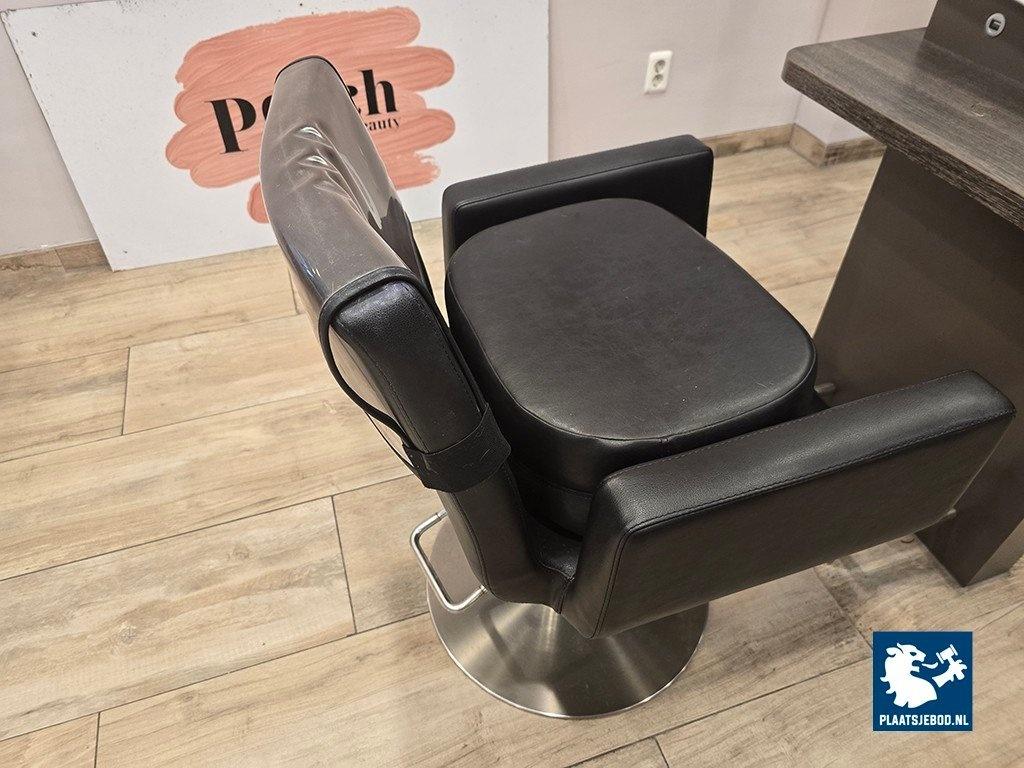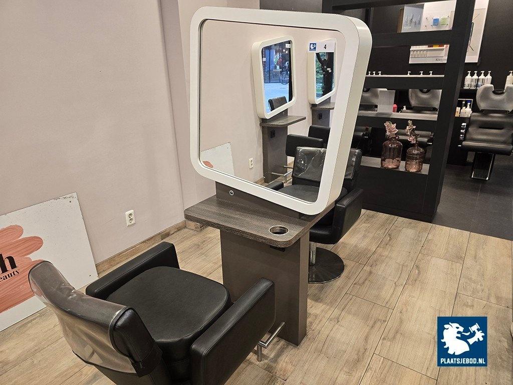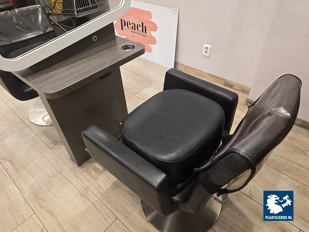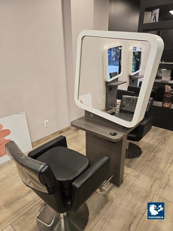 1 x 2-Zijdige kappersspiegel ca 80 x 57 x 170 cm voorzien van voetsteun, elektra en USB aansluiting, met 2 x hydraulisch voetbediende Sibel kappersstoel met stoelverhogers