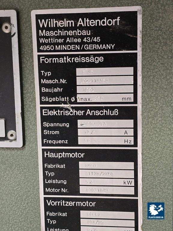 1 x Altendorf formaatzaagmachine F45 bouwjaar 1192. Zaagdiameter max. 350 mm, voorritszaag, 400 Volt met diverse toebehoren