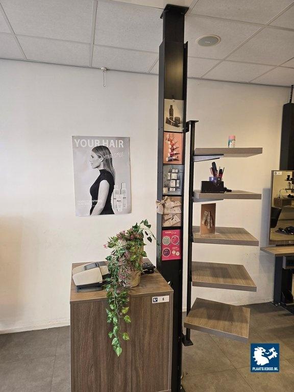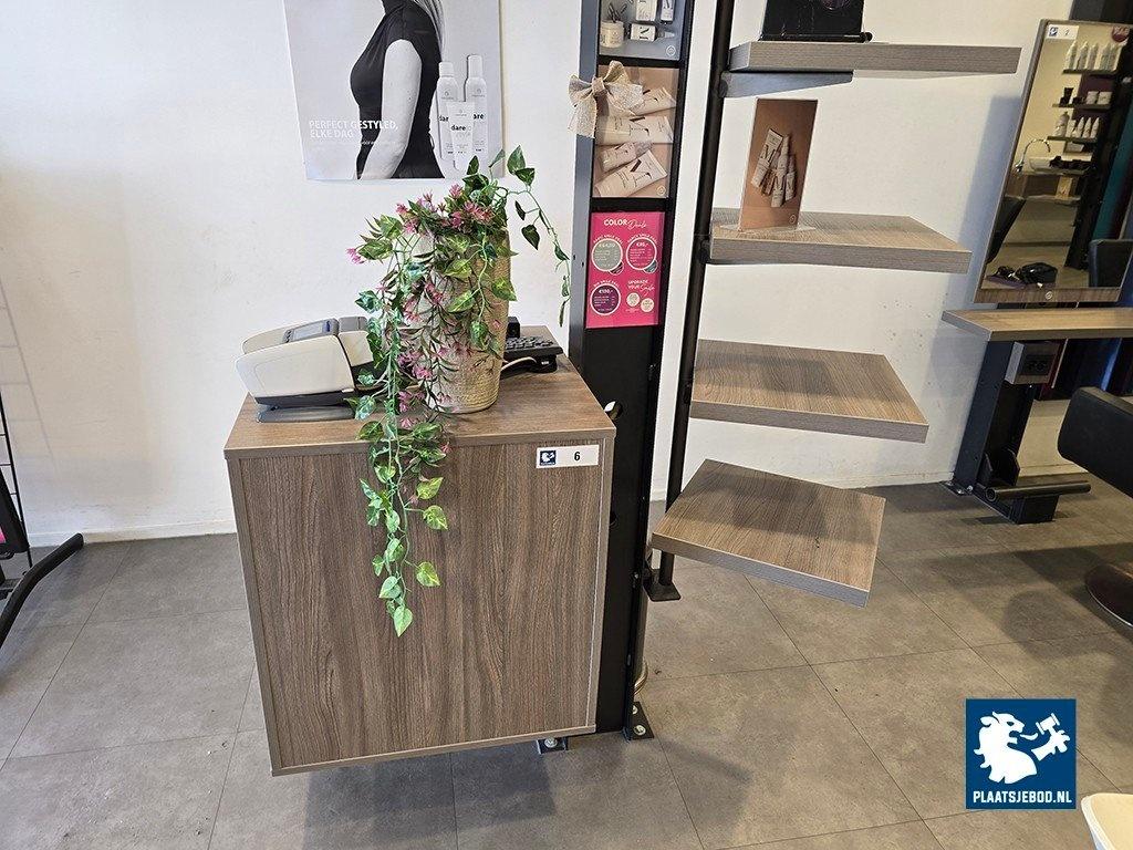 1 x Balie-kassameubel met stroomaansluitingen en etagerek, afm. 60 x 60 x 260 cm.