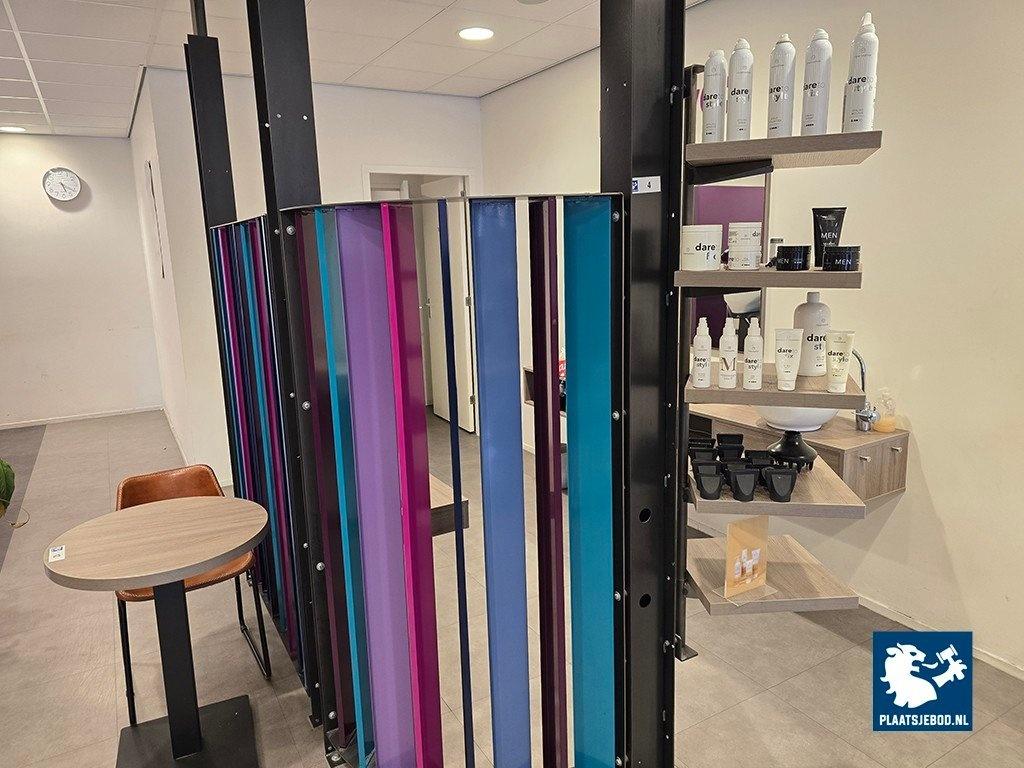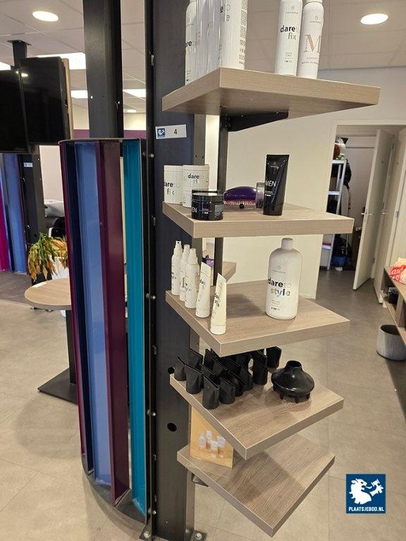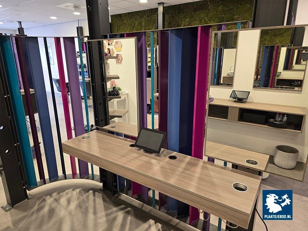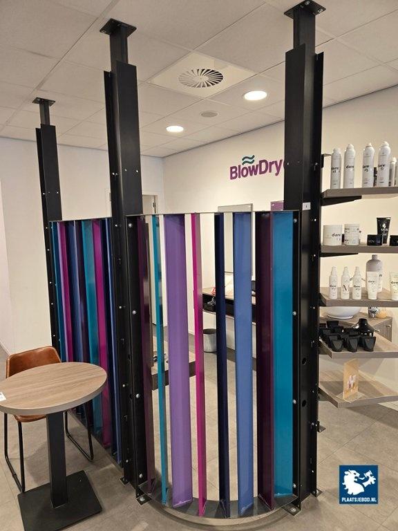 1 x BlowDry opstelling bestaande uit demontabel scheidingswandelement afm.: 160 x 260 cm en 90 graden deel 70x90 cm., etagerek met planken en wandtafel met stroomaansluitingen, spiegels en tablet.