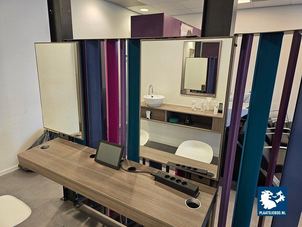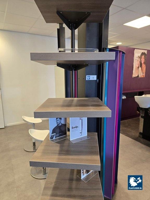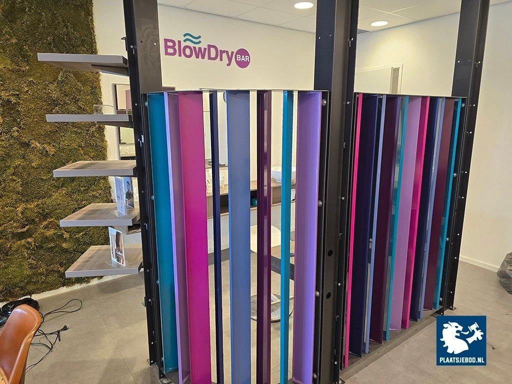 1 x BlowDry opstelling bestaande uit demontabel scheidingswandelement afm.: 160 x 260 cm en 90 graden deel 70x90 cm., etagerek met planken en wandtafel met stroomaansluitingen, speigels en tablet.