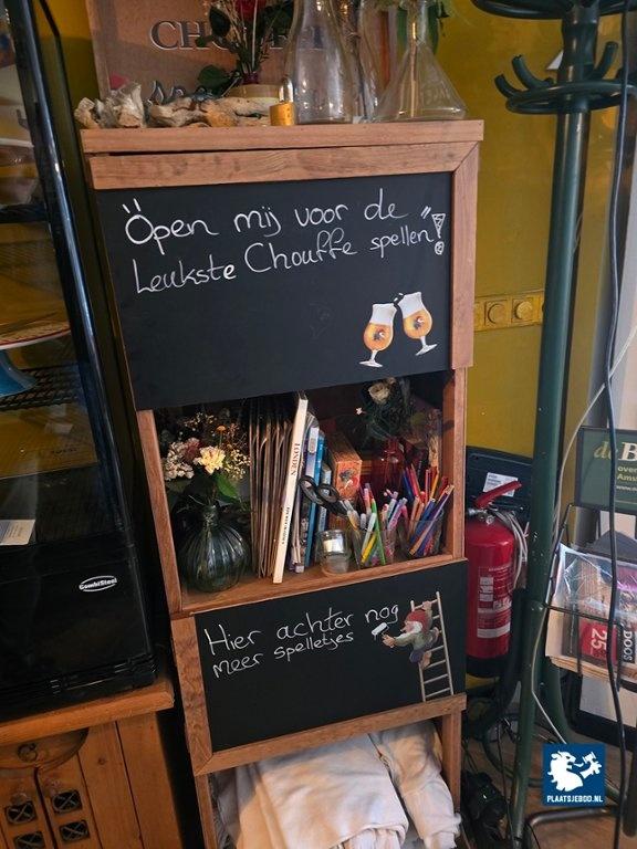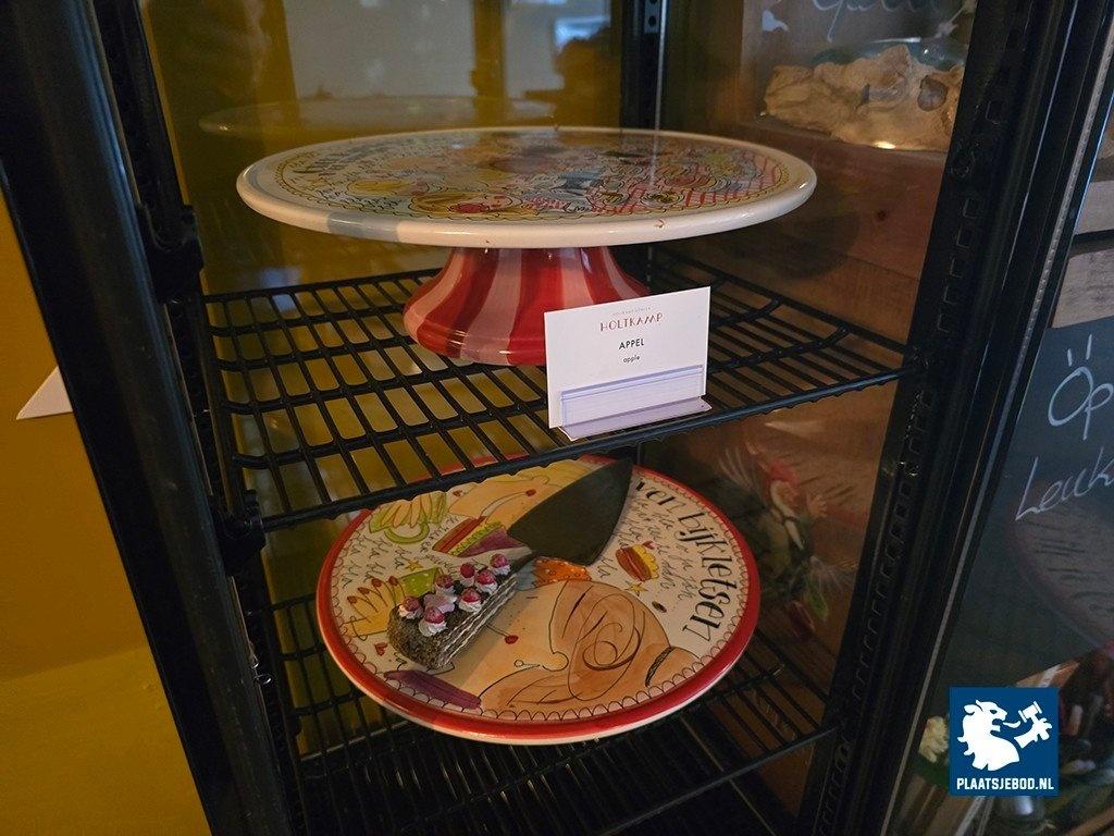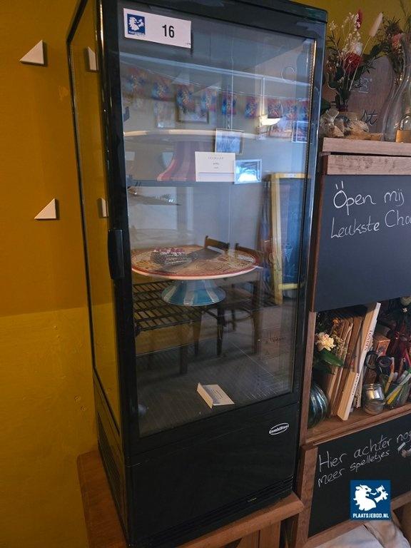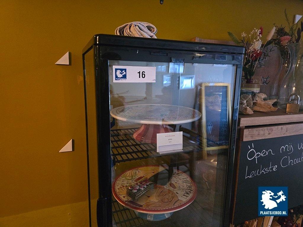 1 x Combisteel gebaksvitrine, gebaksschalen, Chouffe spellenkast met diverse inhoud, etc.