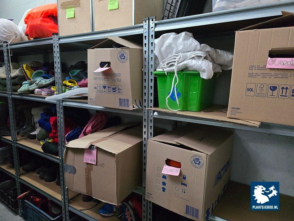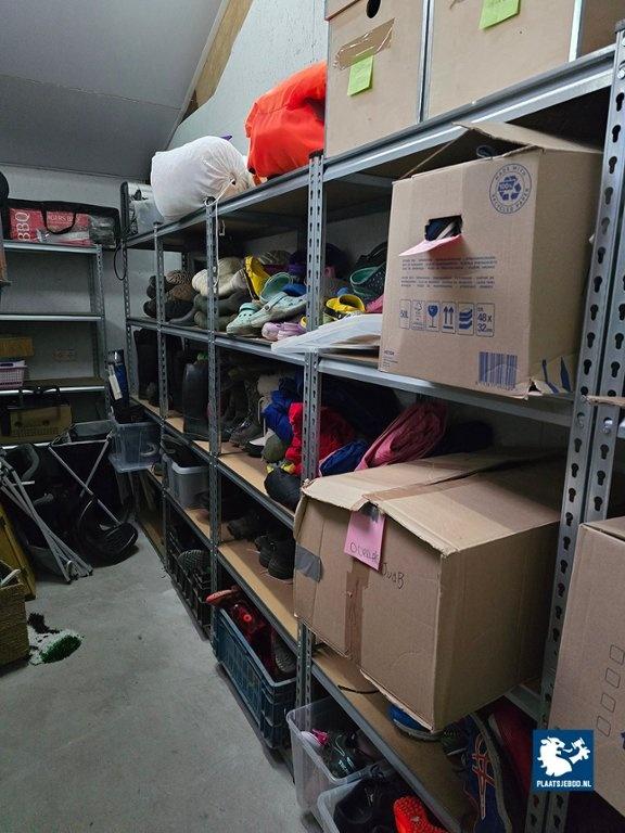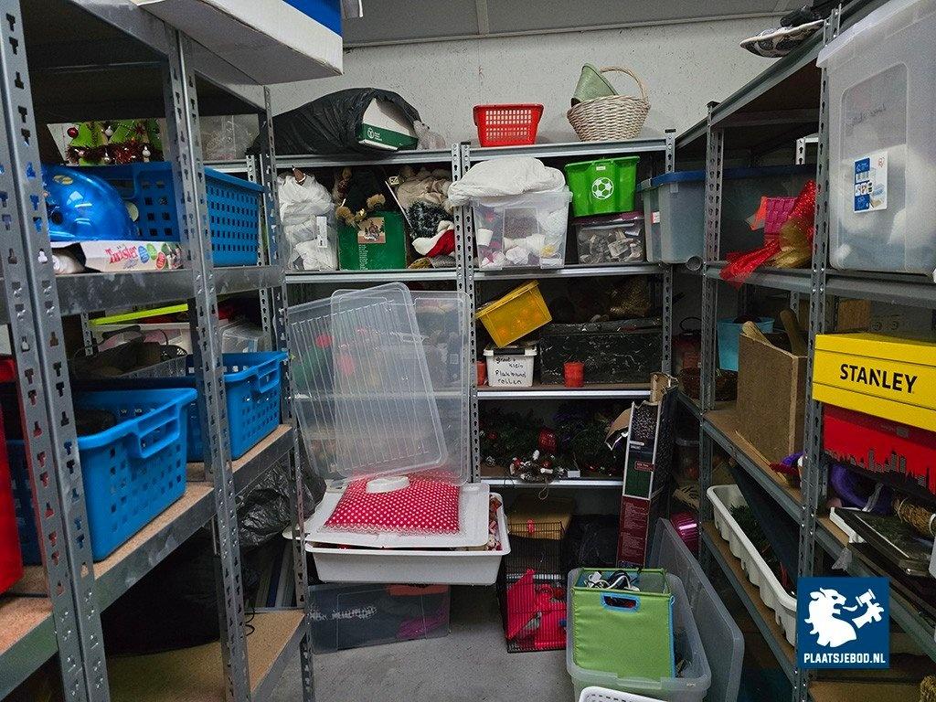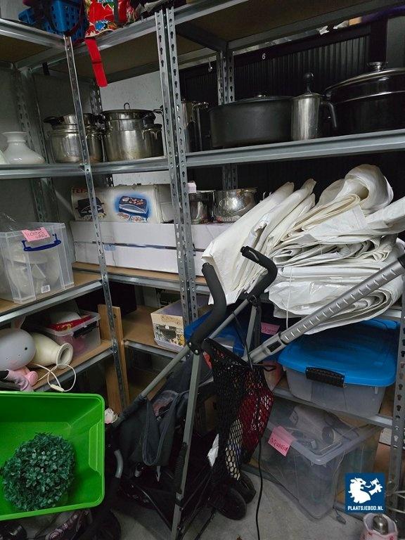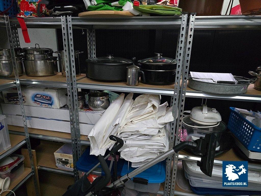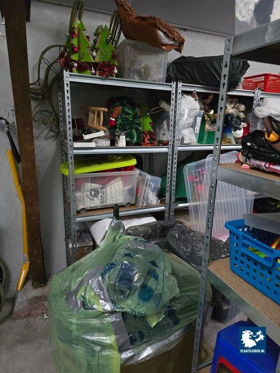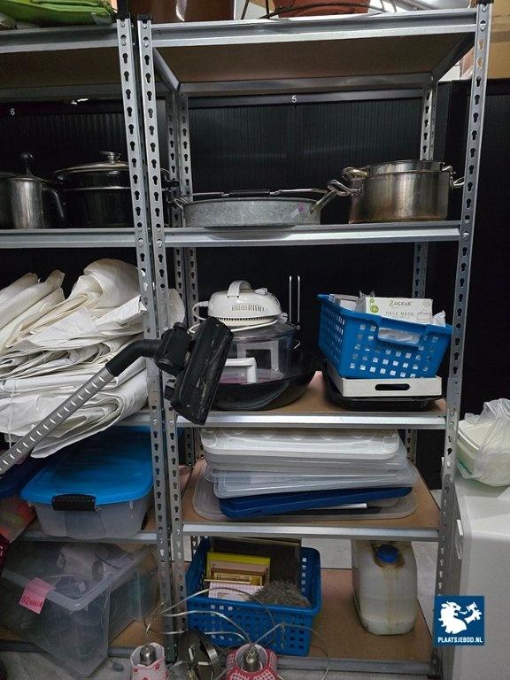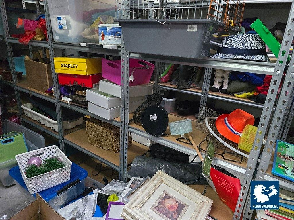 1 x Complete inhoud opslag in ca. 22 sectie stelling. Let op; de koper betaalt € 300,- borg t.b.v. een bezemschone oplevering, deze ontvangt de koper geheel retour bij een nette oplevering.