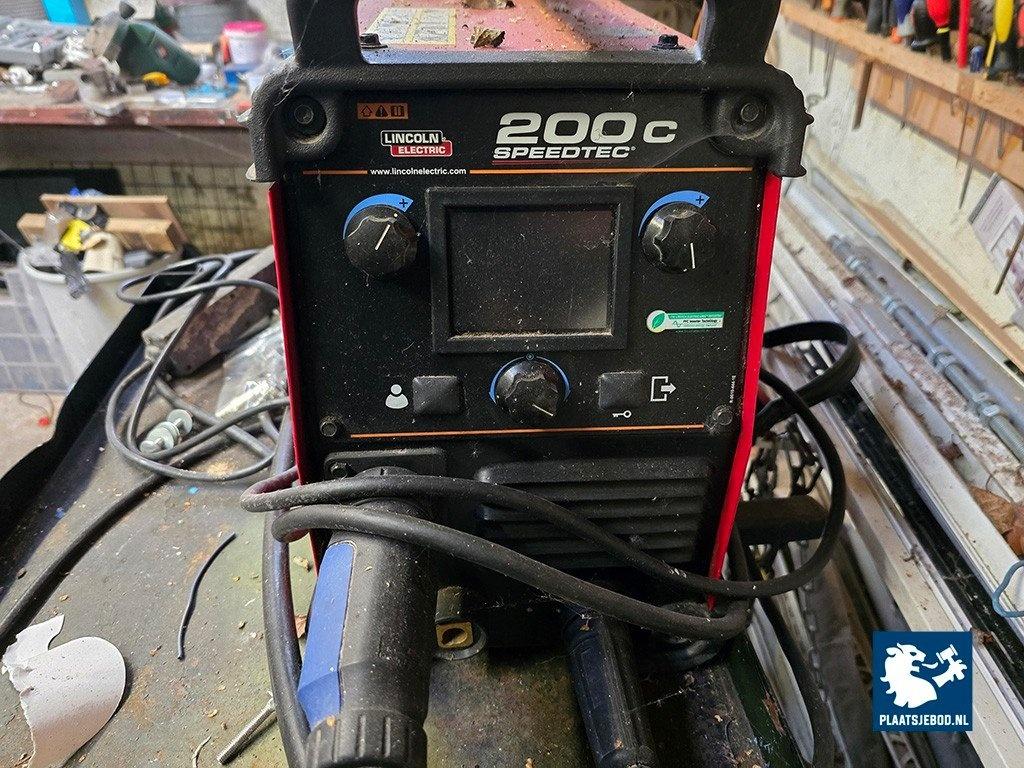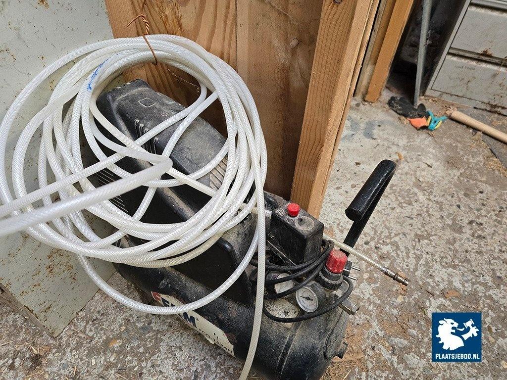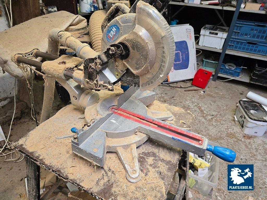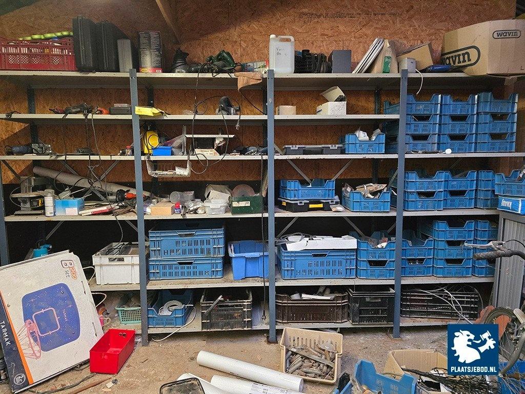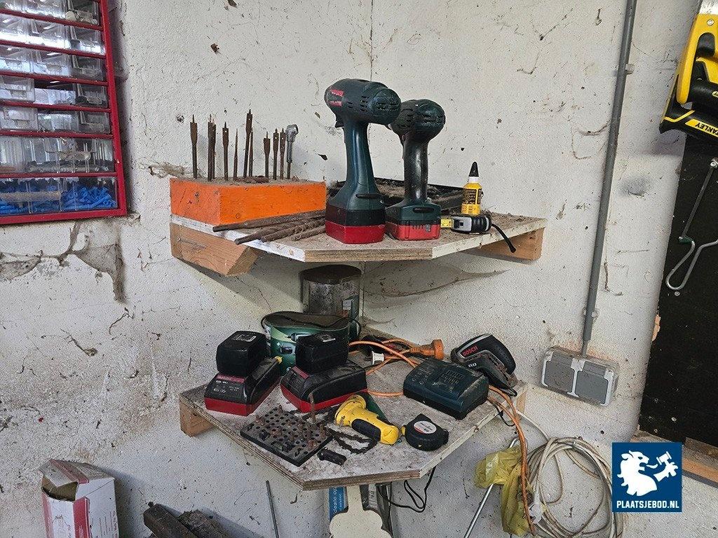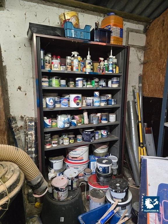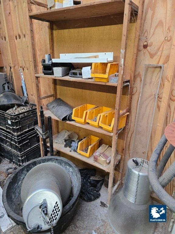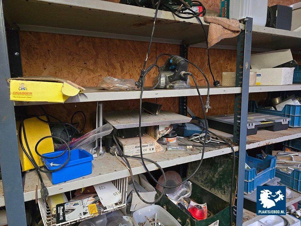 1 x Complete inhoud werkplaats waaronder stellingen, kasten, Lincoln Electric lasapparaat, Ferm afkort- verstekzaag, mobile motafzuiginstallatie, diverse handgereedschappen, Ferm compressor, etc. Let op; de koper betaalt € 300,- borg t.b.v. een bezemschone oplevering, deze ontvangt de koper geheel retour bij een nette oplevering.
