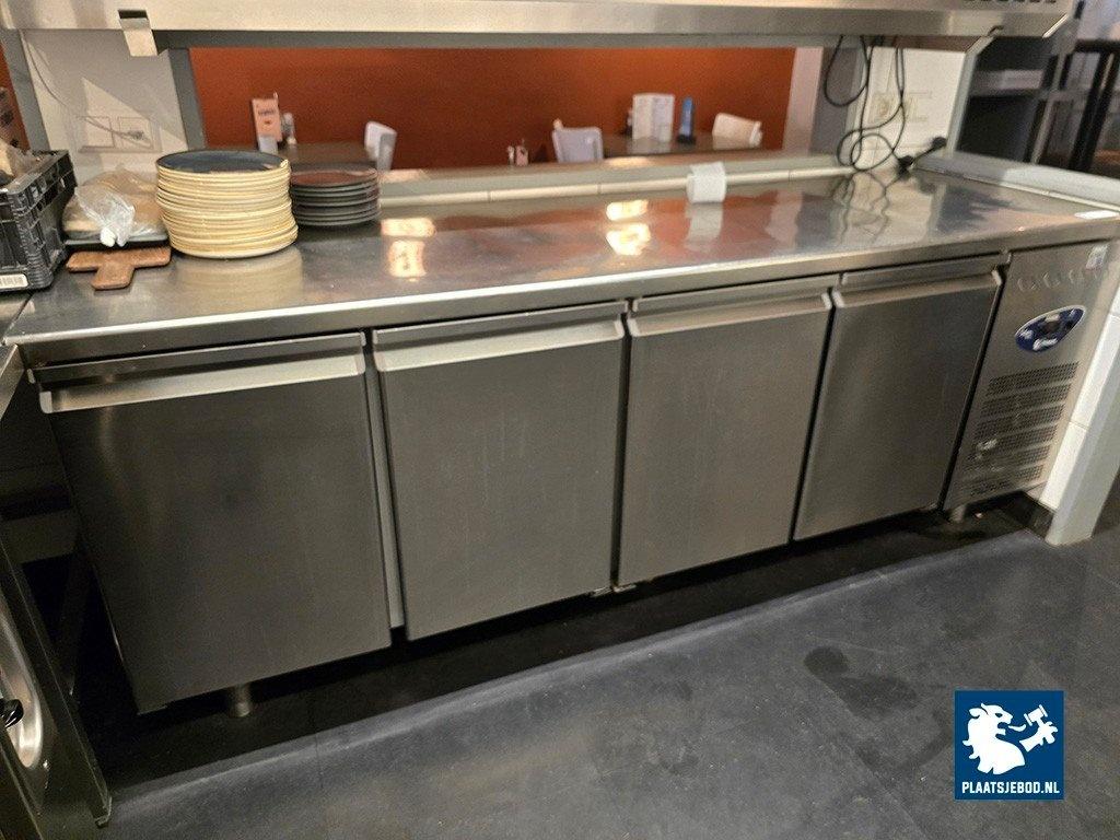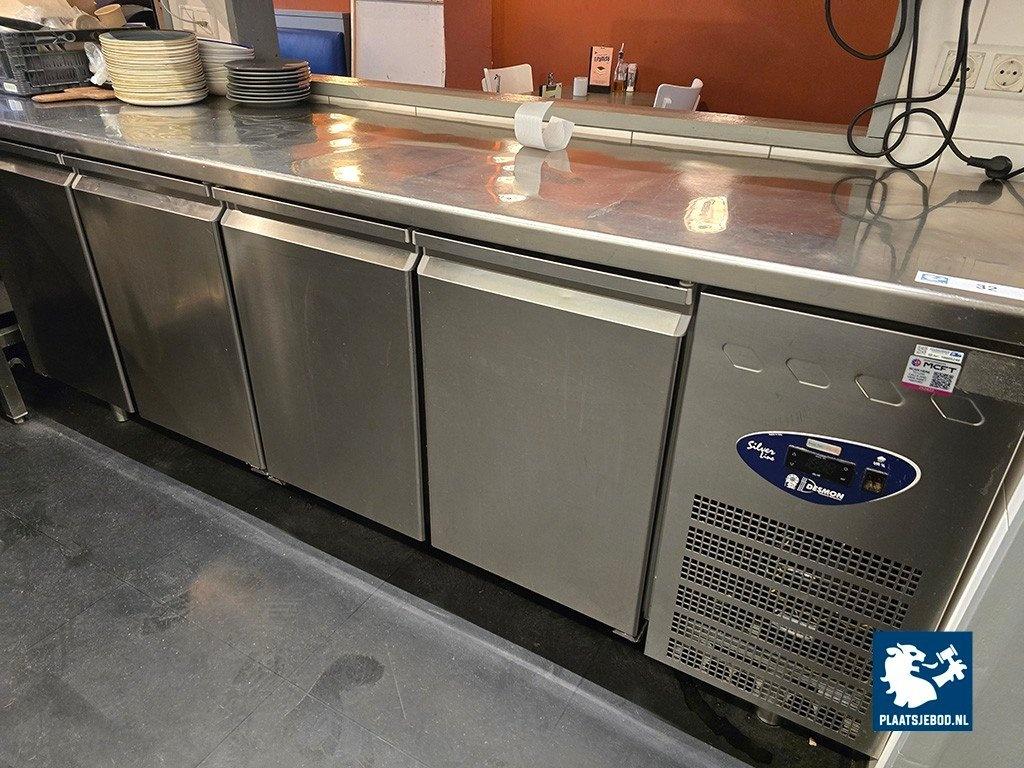 1 x Desmon, RVS koelwerkbank, 4 deuren, afm.: 227 x 70 cm.