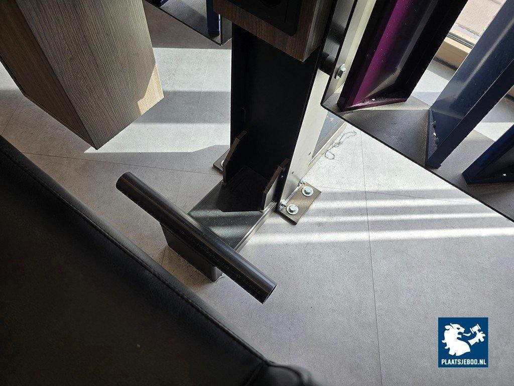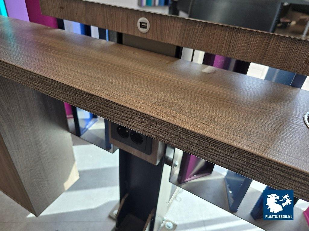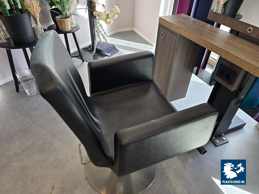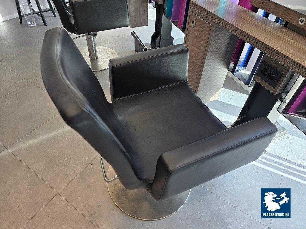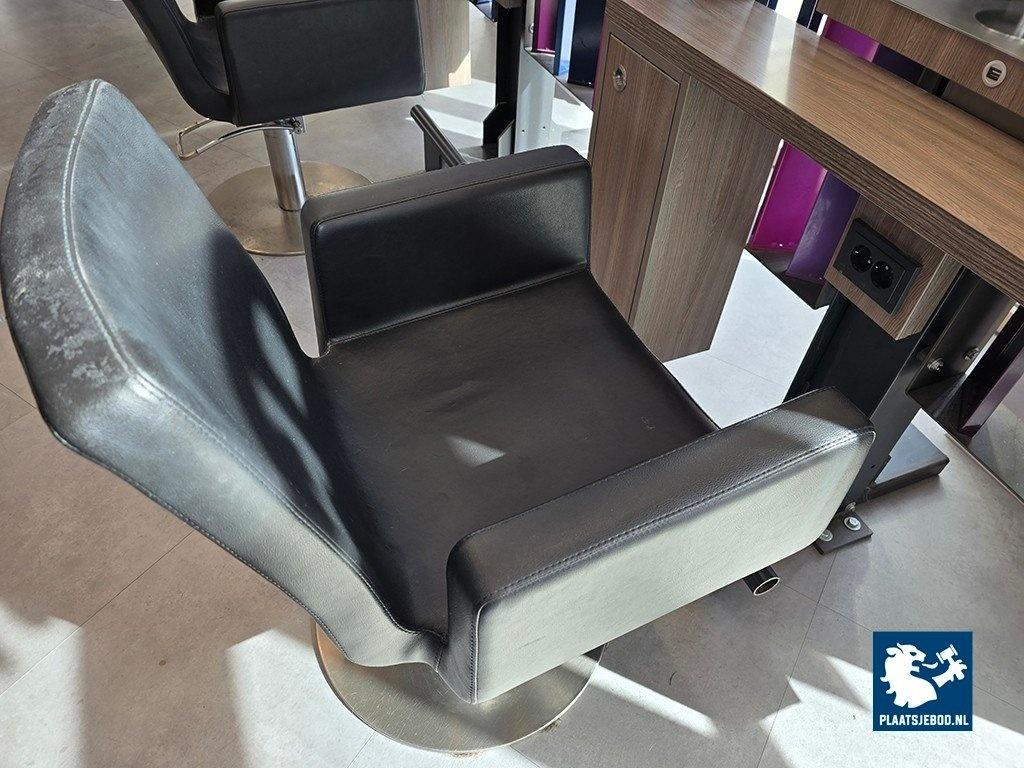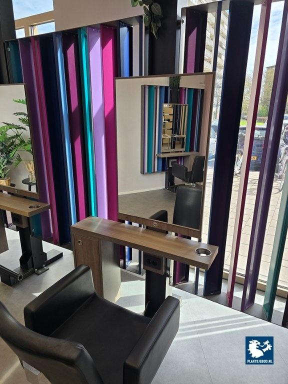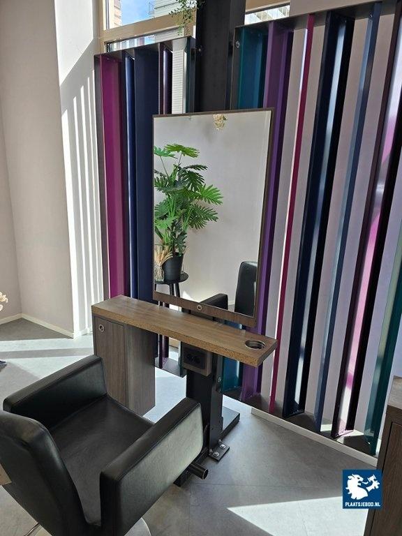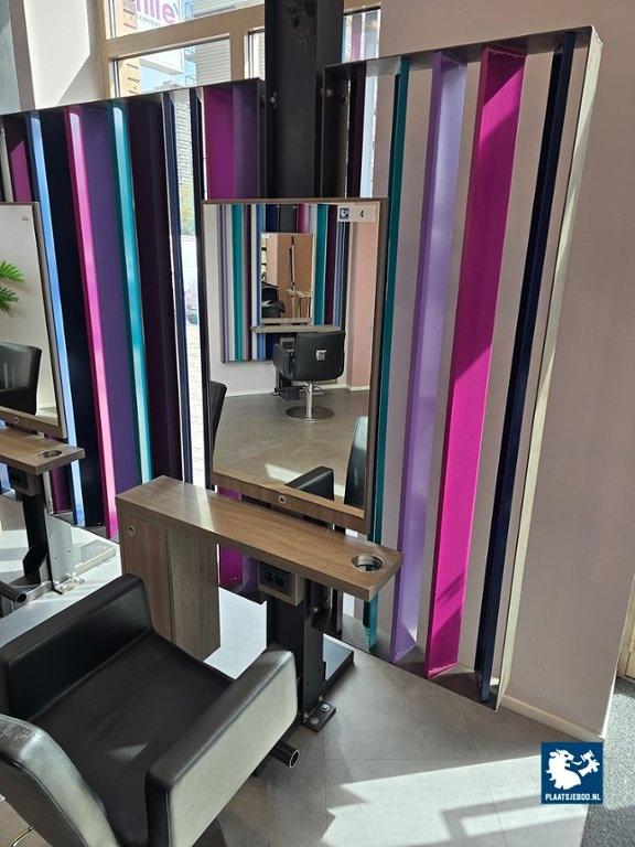 1 x Driedubbele kapspiegelopstelling bestaande uit demontabel frame met 3 kapspiegels, stroomaansluitingen, USB aansluitingen, voetensteunen en 3 Sibel hydraulische voetbediende kappersstoelen, afmetingen spiegelopstelling: BXH 375 x 260 cm. (hoogte instalbaar)