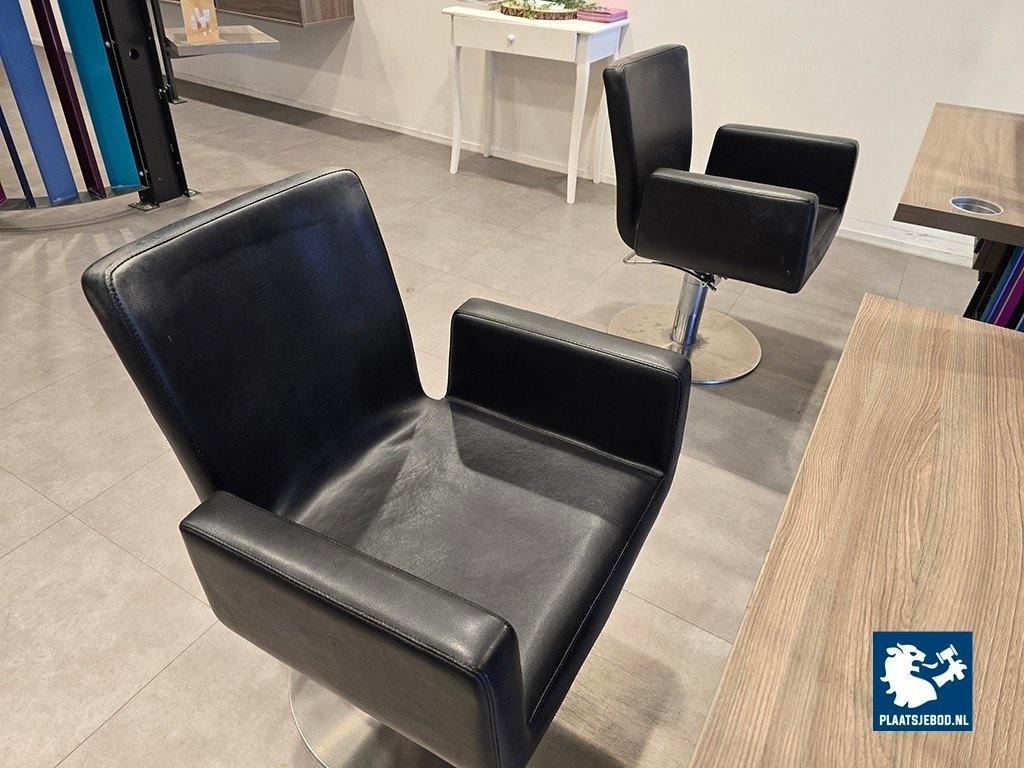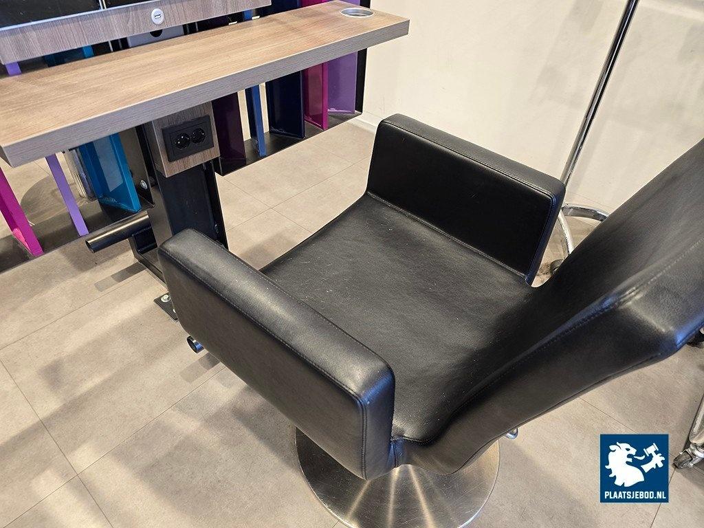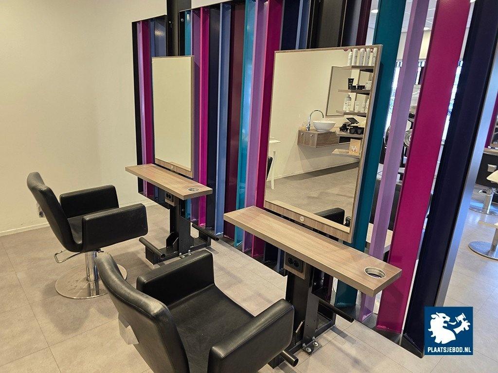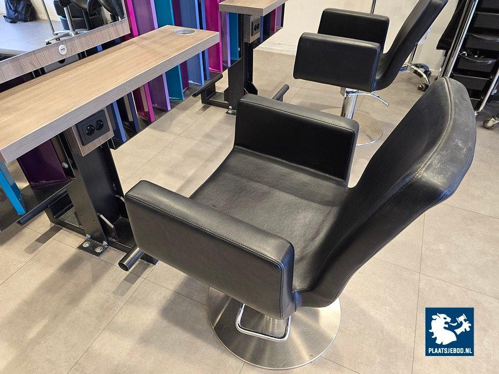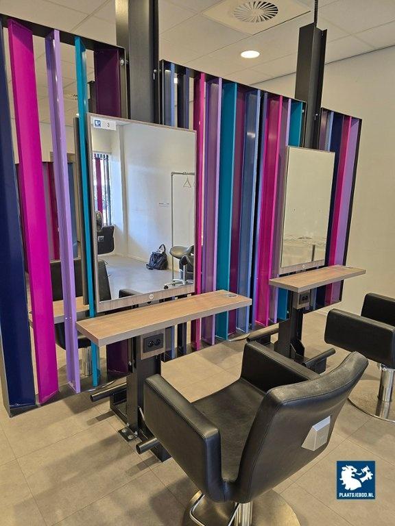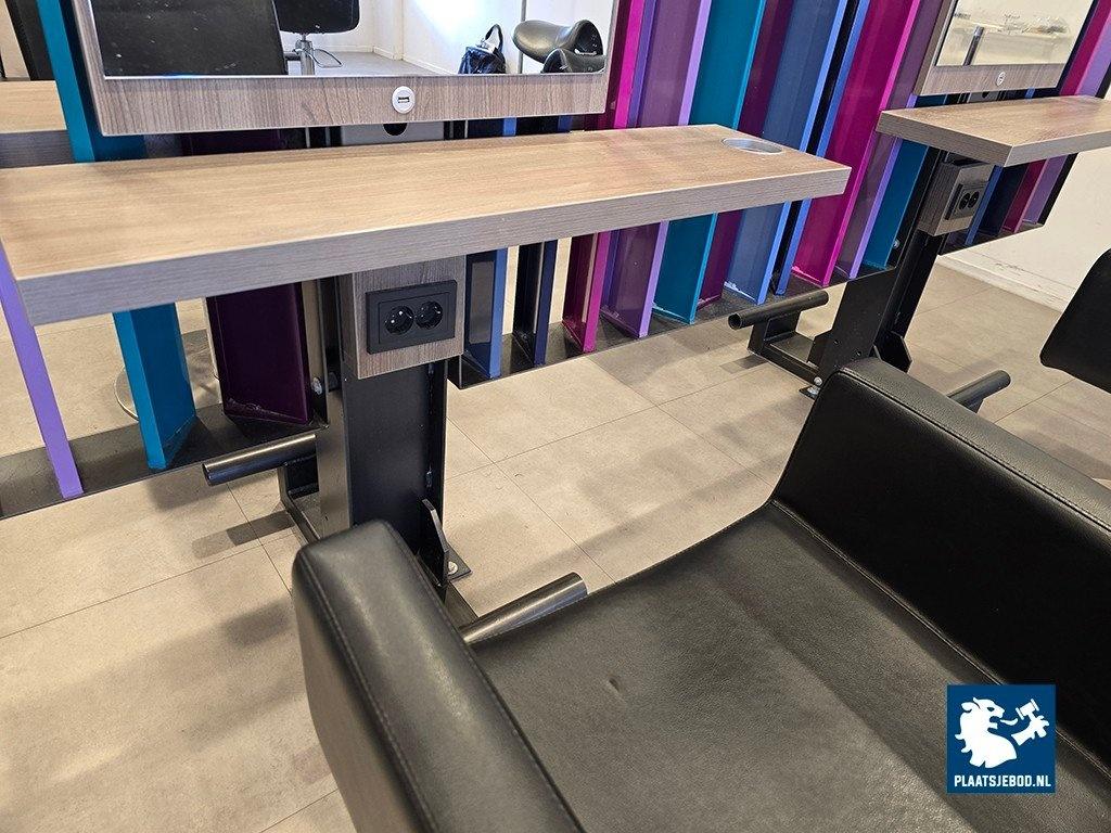 1 x Dubbele 2-zijdige kapspiegelopstelling bestaande uit demontabel frame met 4 kapspiegels, stroomaansluitingen, USB aansluitingen, voetensteunen en 4 Sibel hydraulische voetbediende kappersstoelen, afmetingen spiegelopstelling: BXH 235 x 260 cm. (hoogte instelbaar)