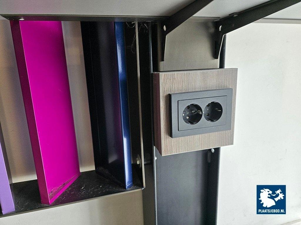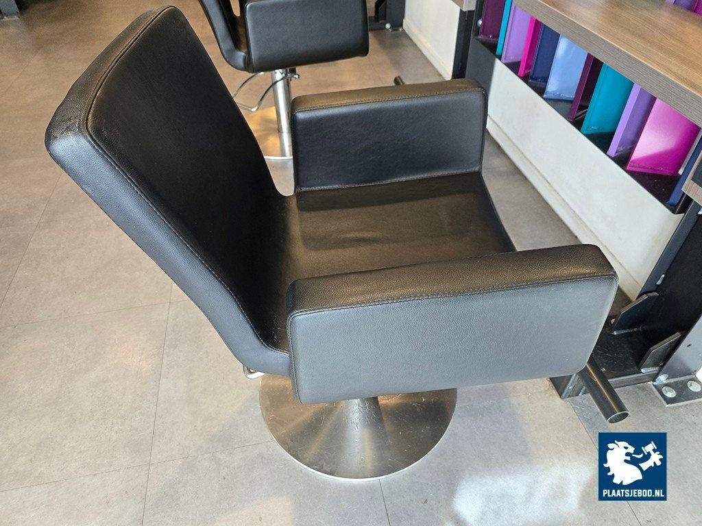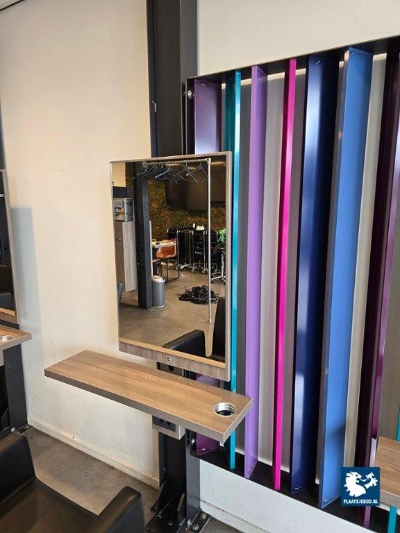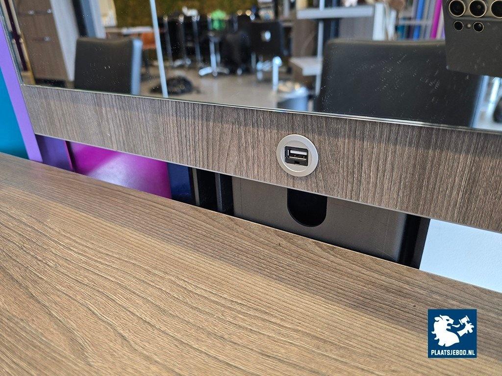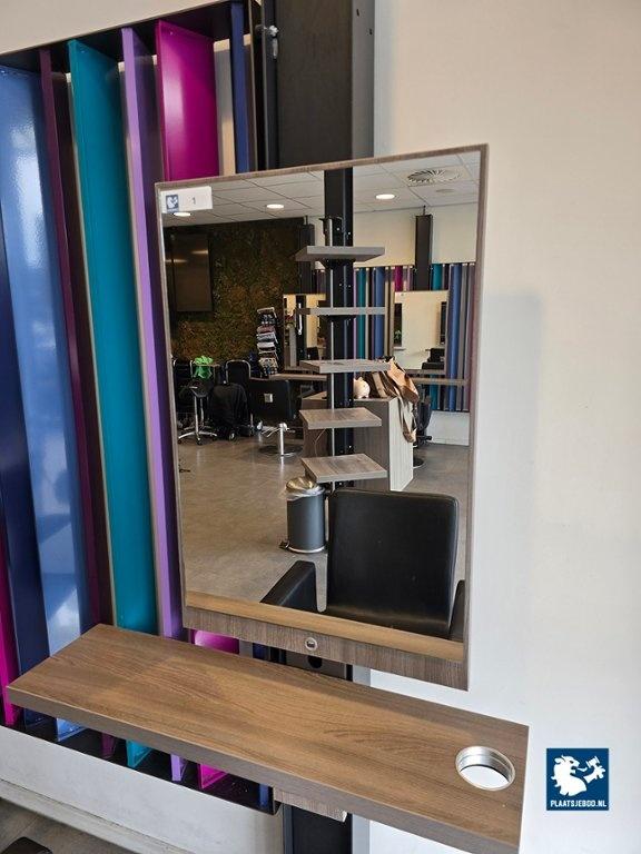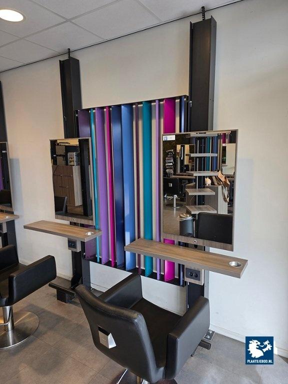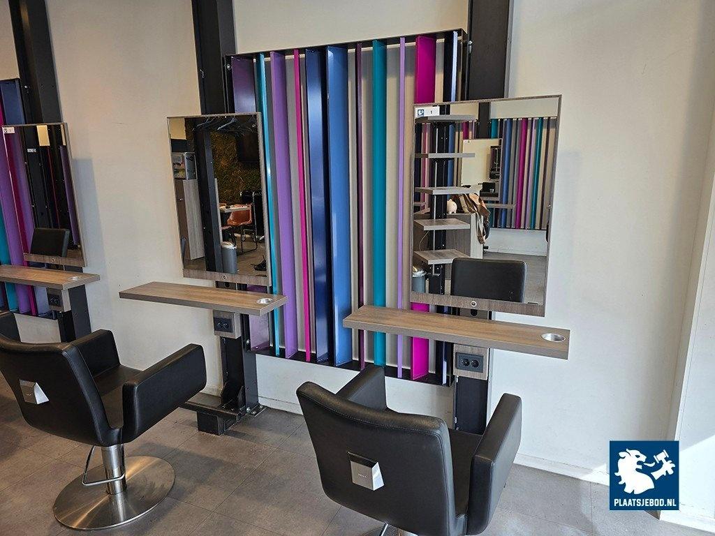 1 x Dubbele kapspiegelopstelling bestaande uit demontabel frame met 2 kapspiegels, stroomaansluitingen, USB aansluitingen, voetensteunen en 2 Sibel hydraulische voetbediende kappersstoelen, afmetingen spiegelopstelling: BXH 235 x 260 cm. (hoogte instalbaar)