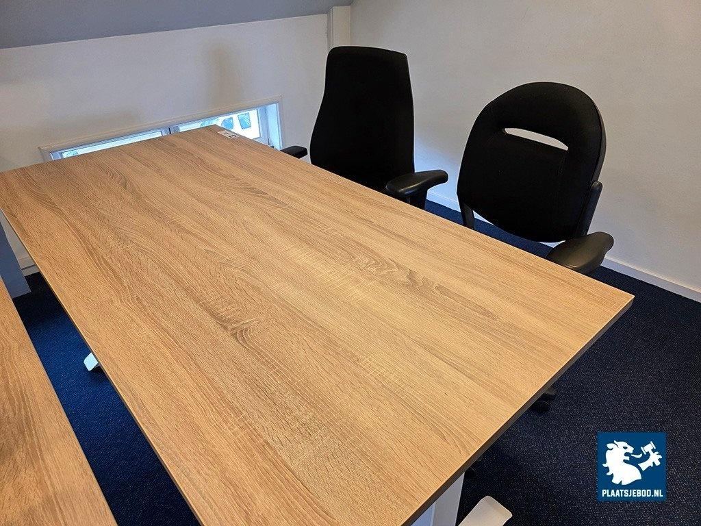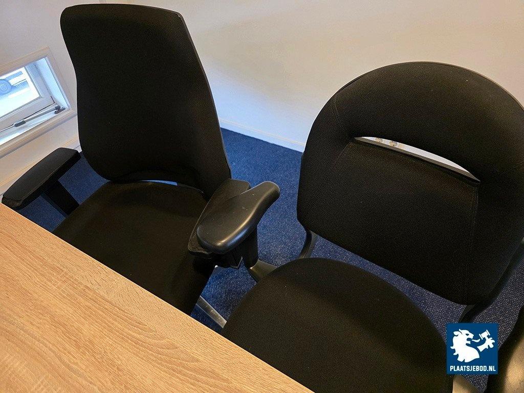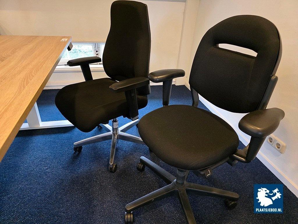 1 x Elektrisch in hoogte verstelbaar bureau ca. 160 x 80 cm met 2 x verrijdbare gasgeveerde bureaustoel met armleggers