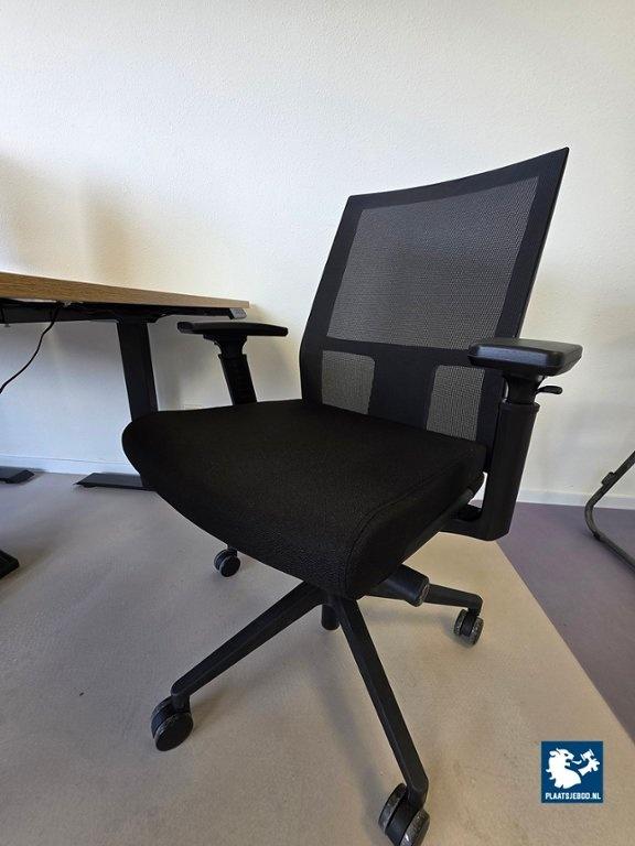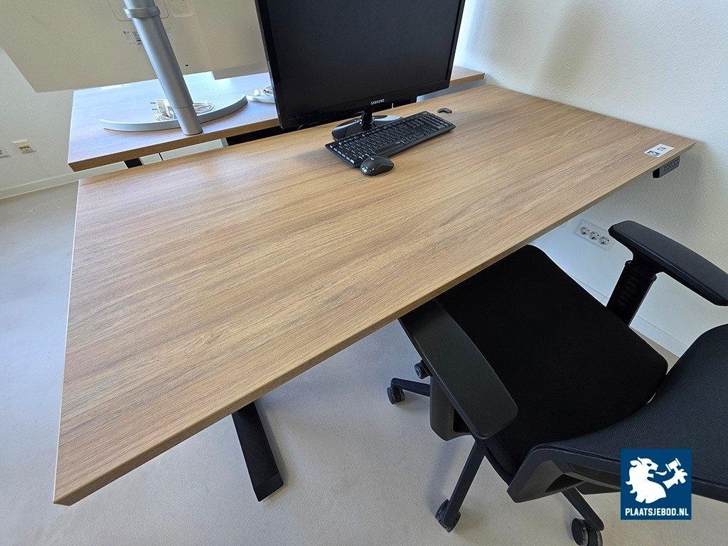 1 x Elektrisch in hoogte verstelbaar bureau ca. 160 x 80 cm met verrijdbare gasgeveerde in hoogte verstelbare bureaustoel met armleggers en mesh rugleuning