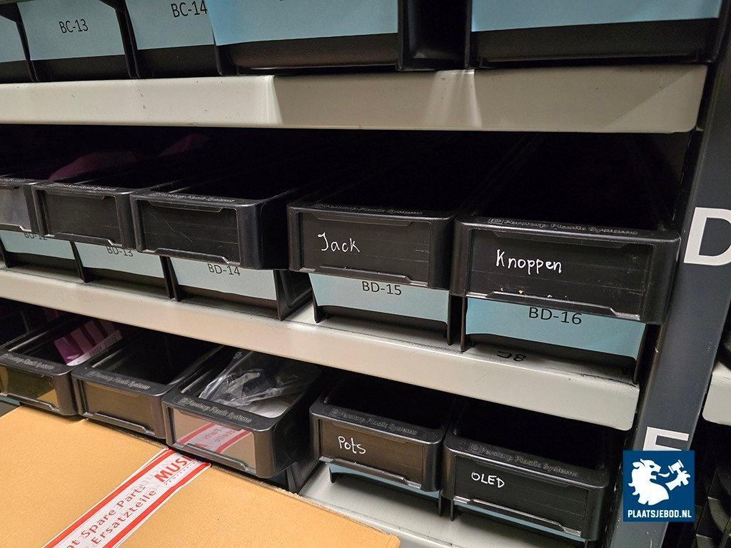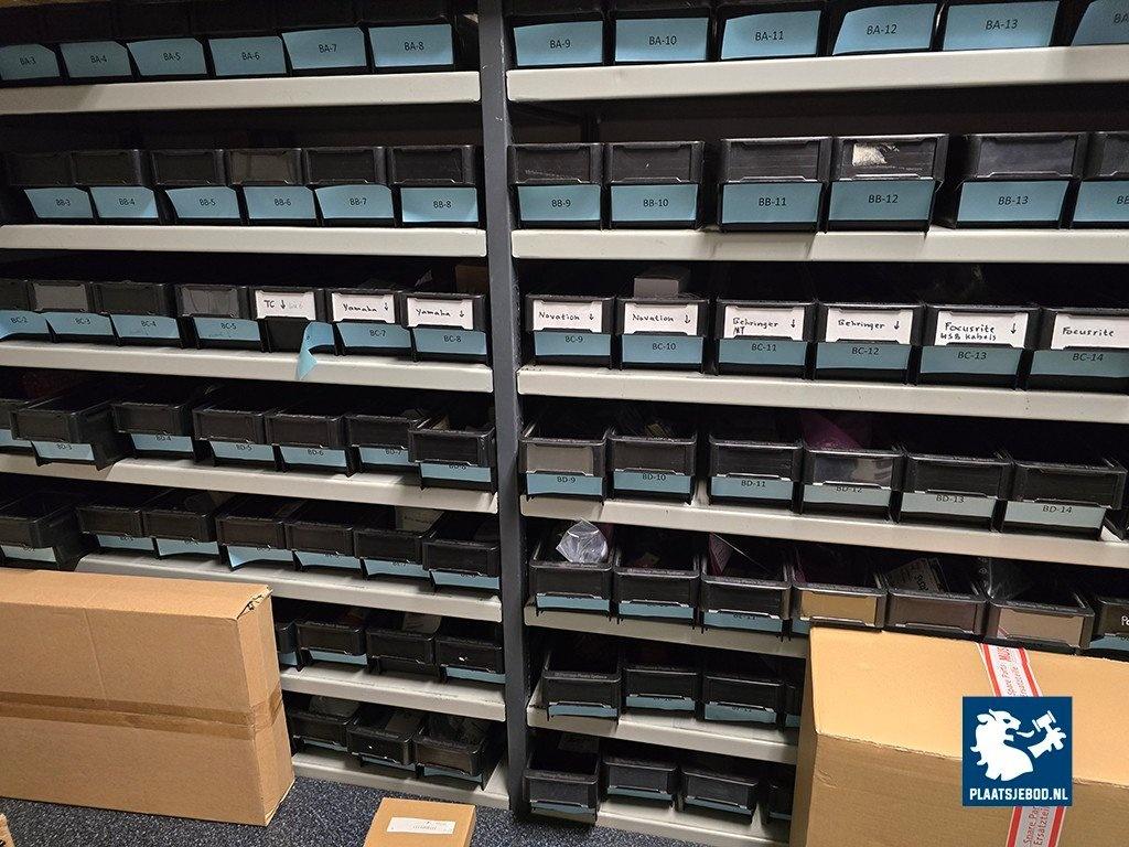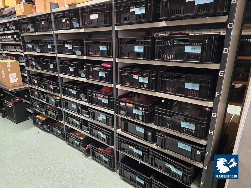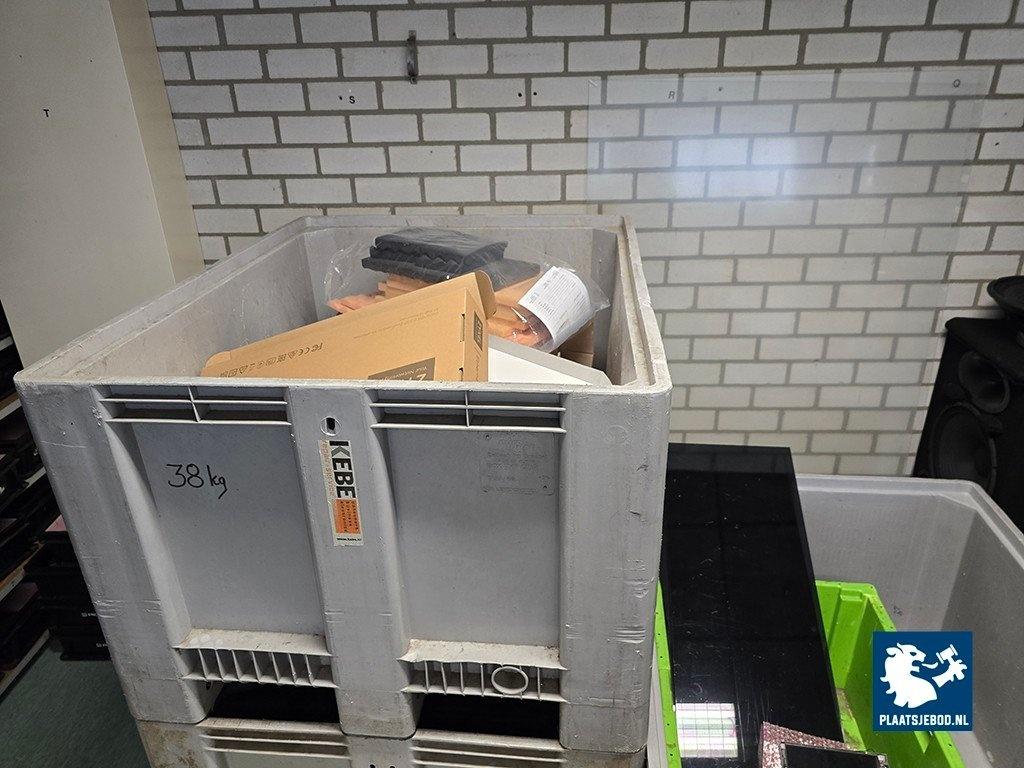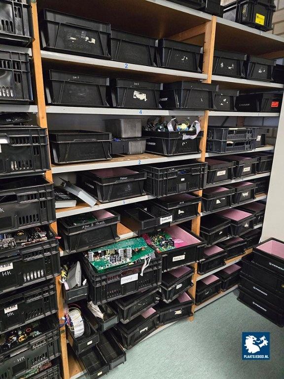 1 x Grote partij van ca. 100 kunststof bakken met diverse spareparts, printplaten, 5 x palletbox, etc. N.B. zonder stellingen