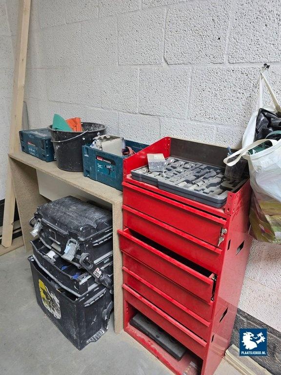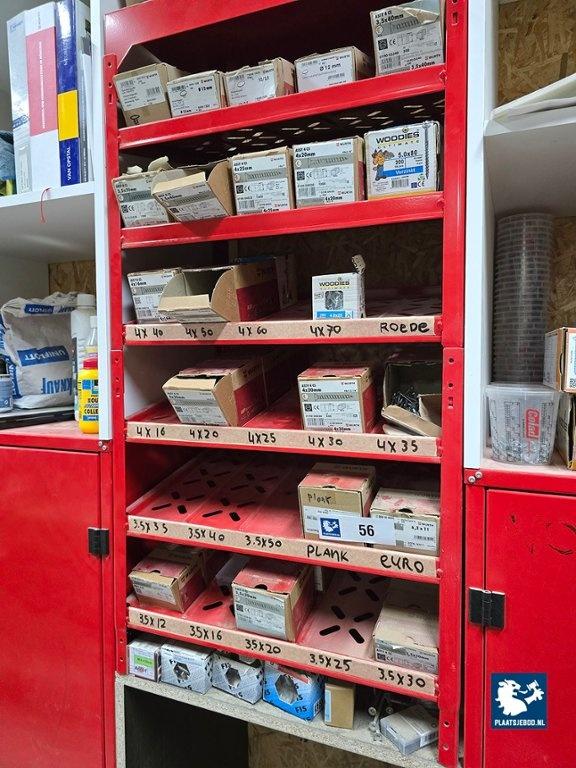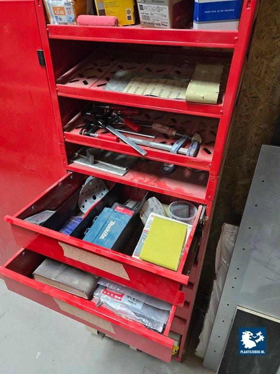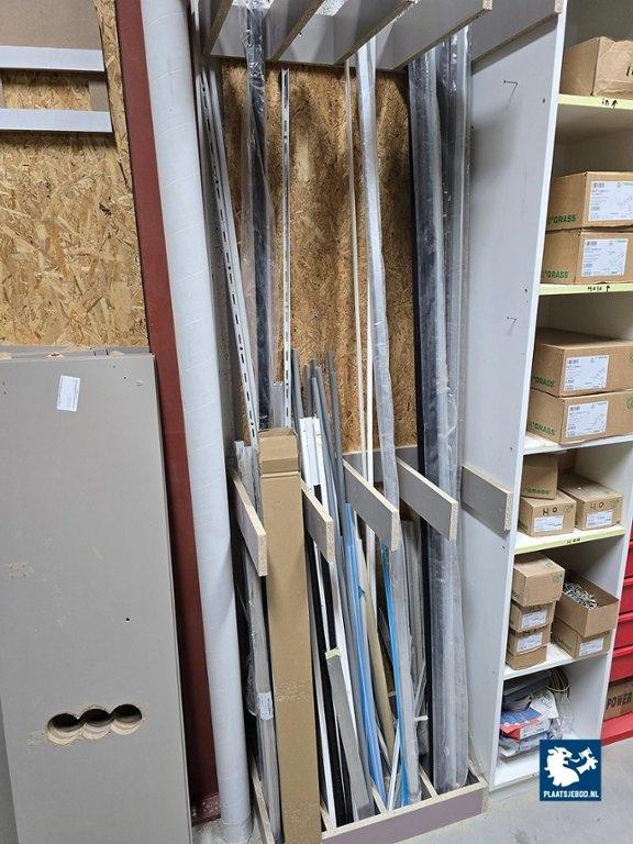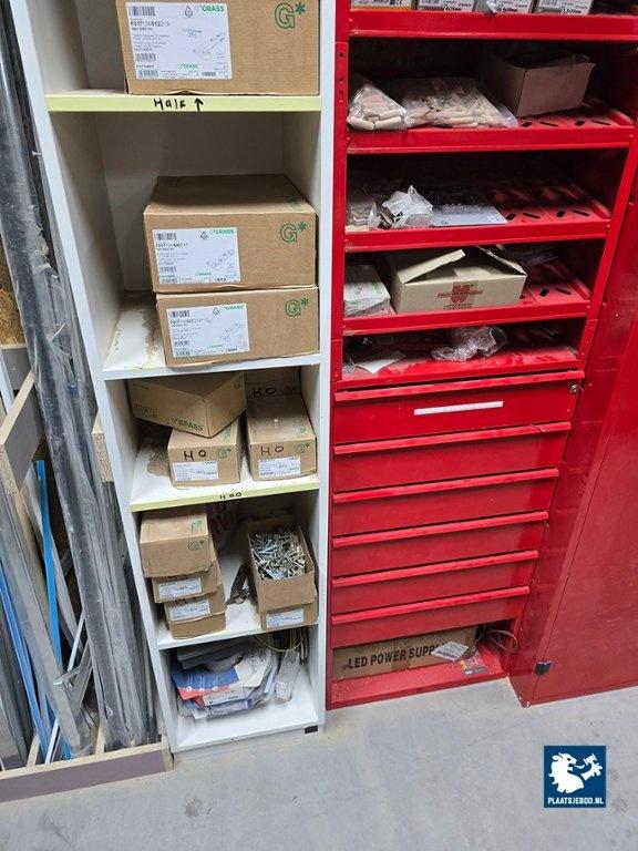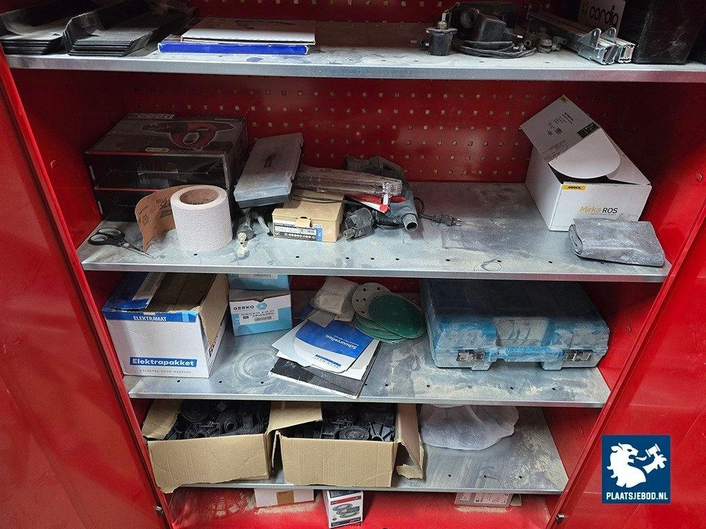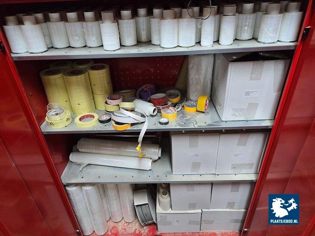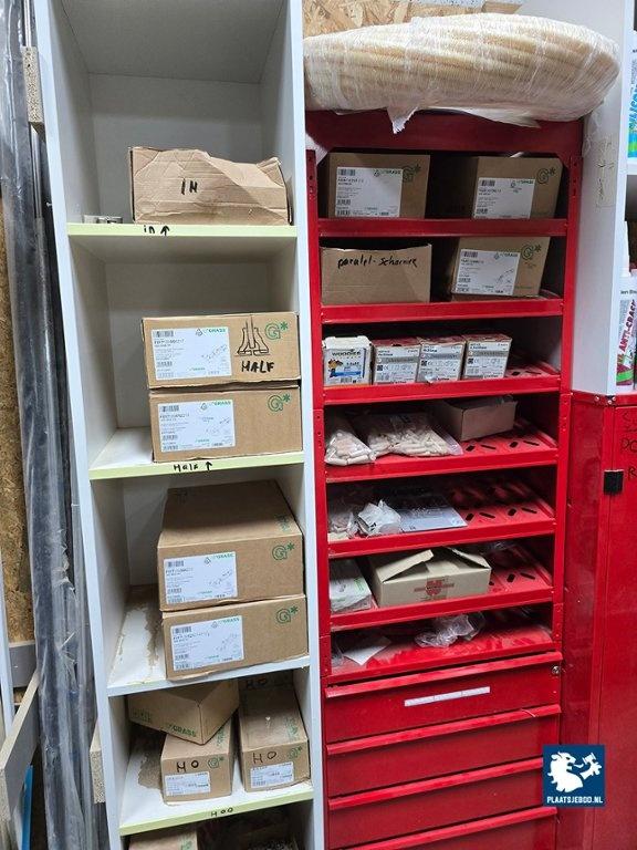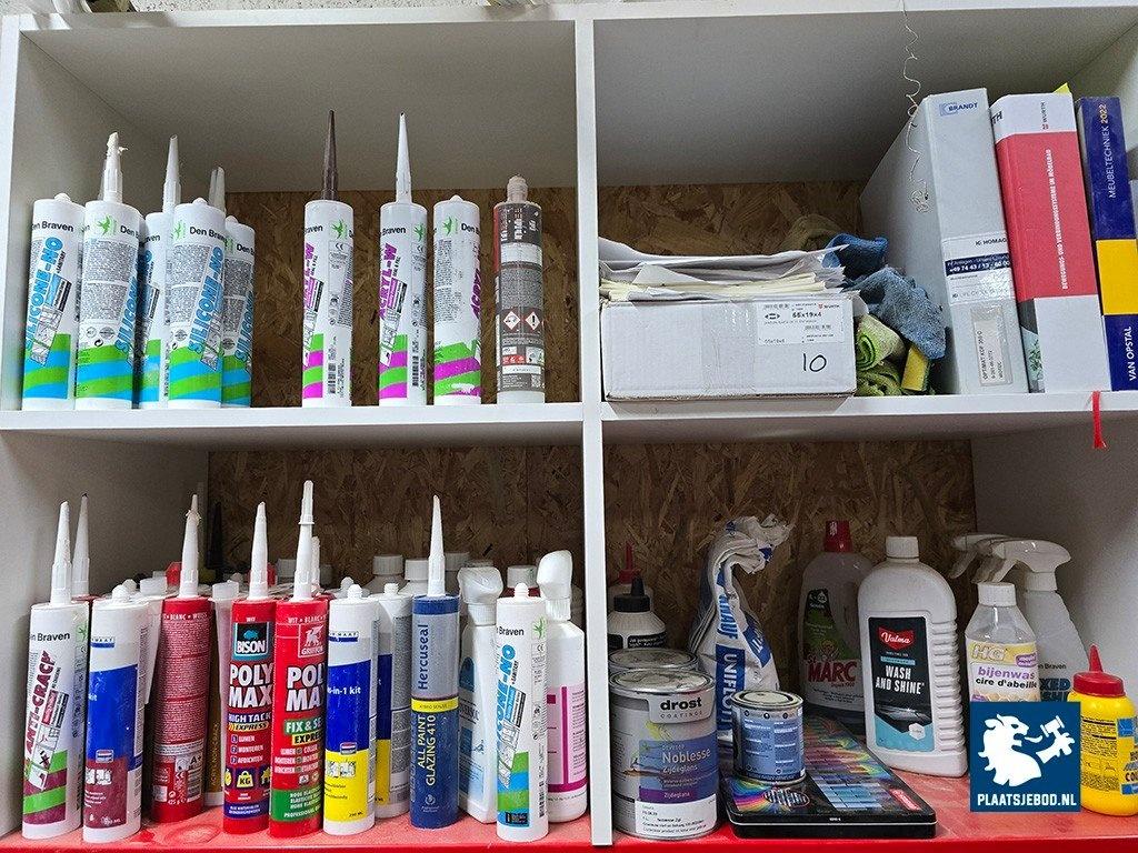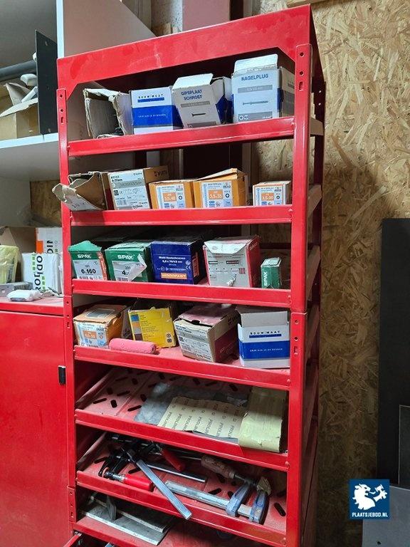 1 x Grote partij in kast waaronder kitten, ijzerwaren, profielen, tape, krimfolies, etc. uitgezonderd rood metalen wurth stelling/ ladekast. Let op; de koper betaalt € 300,- borg t.b.v. een bezemschone oplevering, deze ontvangt de koper geheel retour bij een nette oplevering.