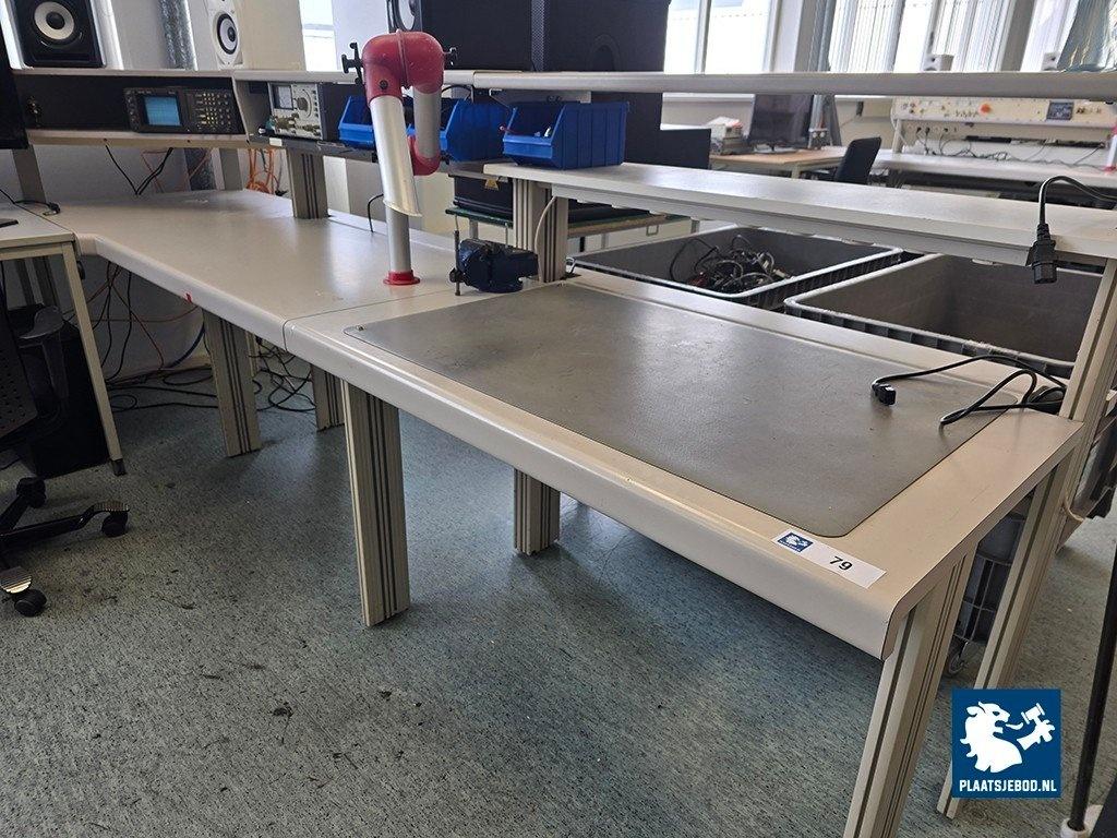 Kavel 323-079: 1 x Hoekopstelling met werktafels met opstand, diverse meet/ testapparatuur, etc.