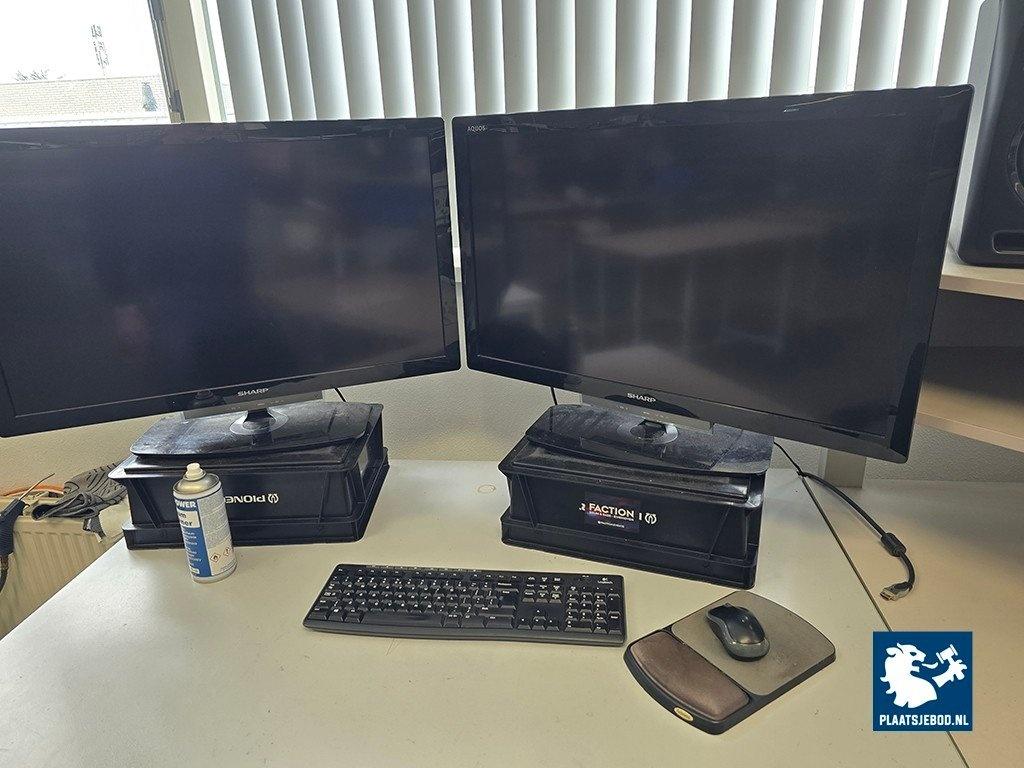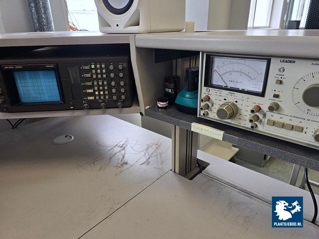 1 x Hoekopstelling met werktafels met opstand, bureaustoel, PC met dubbele Sharp monitor diverse meet/ testapparatuur, etc.