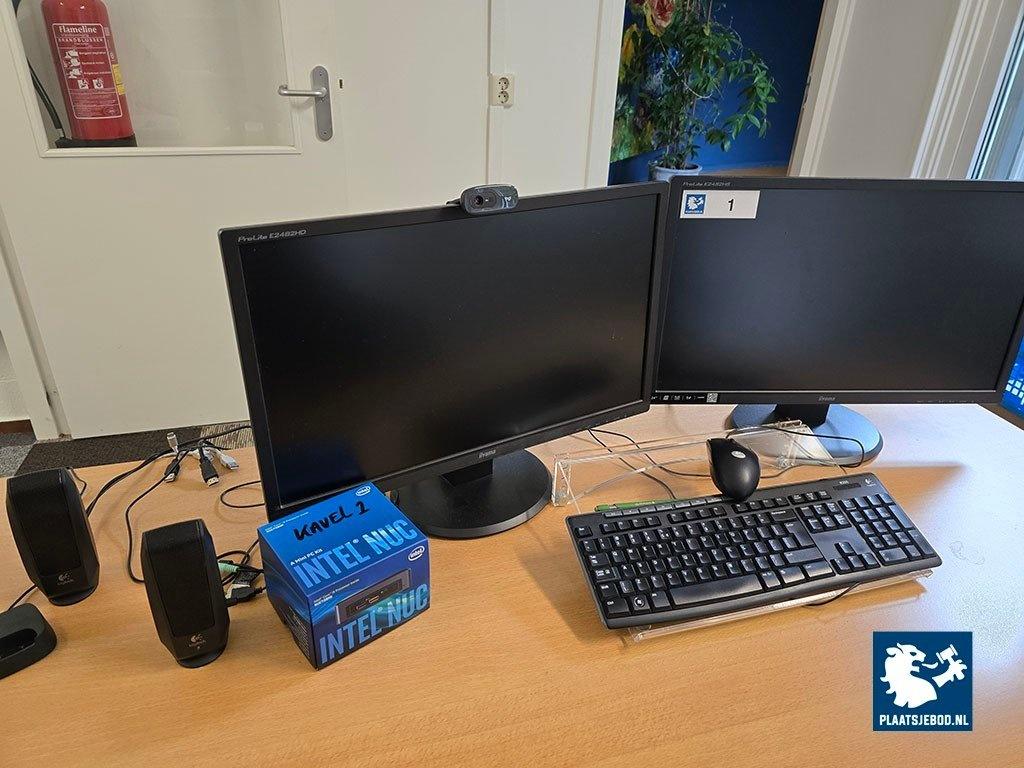 1 x Intel NUC met 2 x Llyama 24 inch, Logitech PC speakers en Brother labelprinter