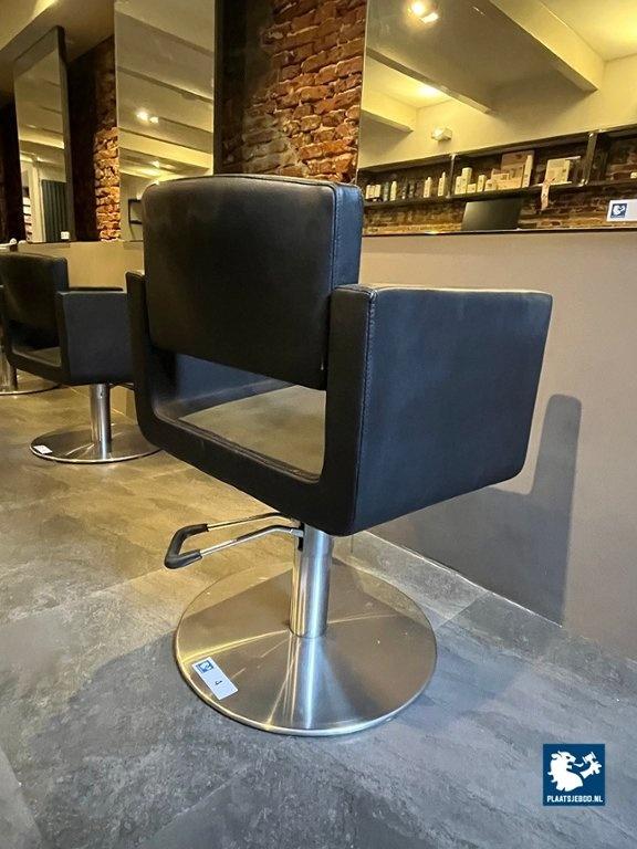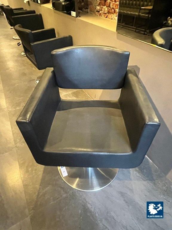 1 x Kapperstoel, kubusachtig ontwerp, zwart leer, in hoogte verstelbaar, met gasveer, chroom ronde voet