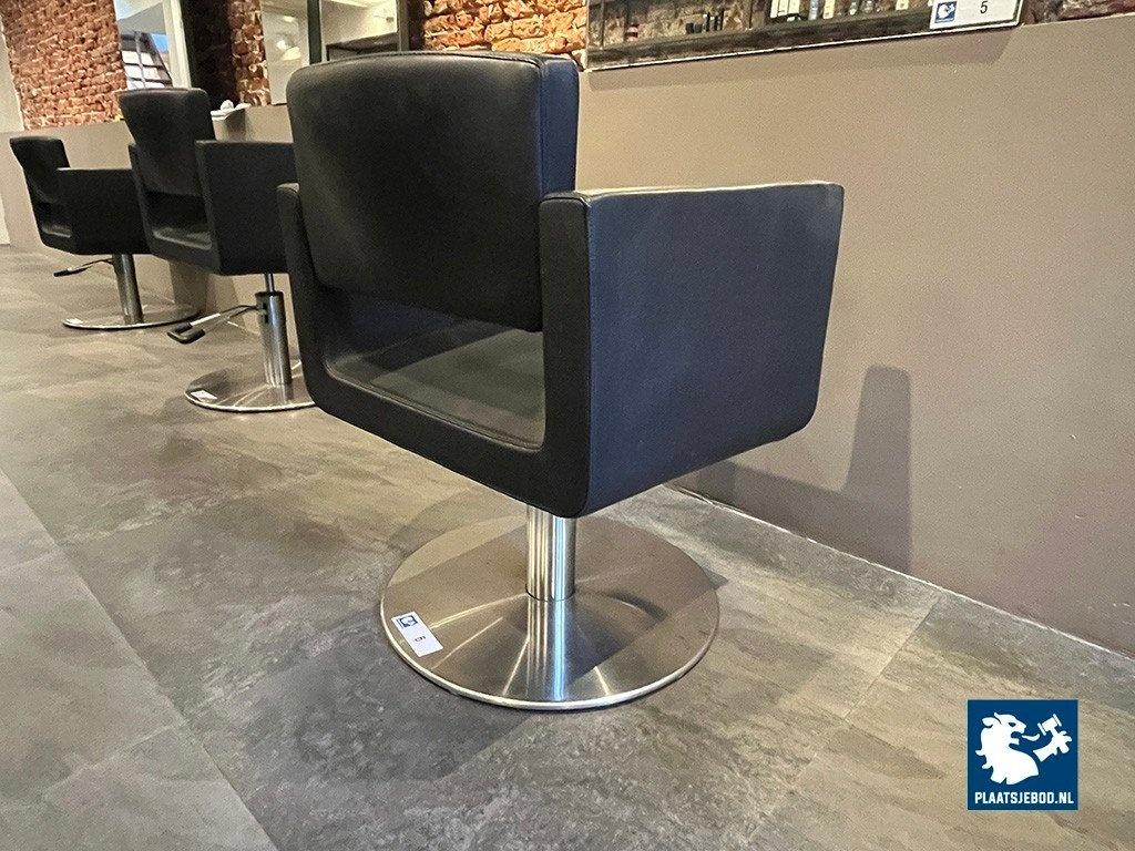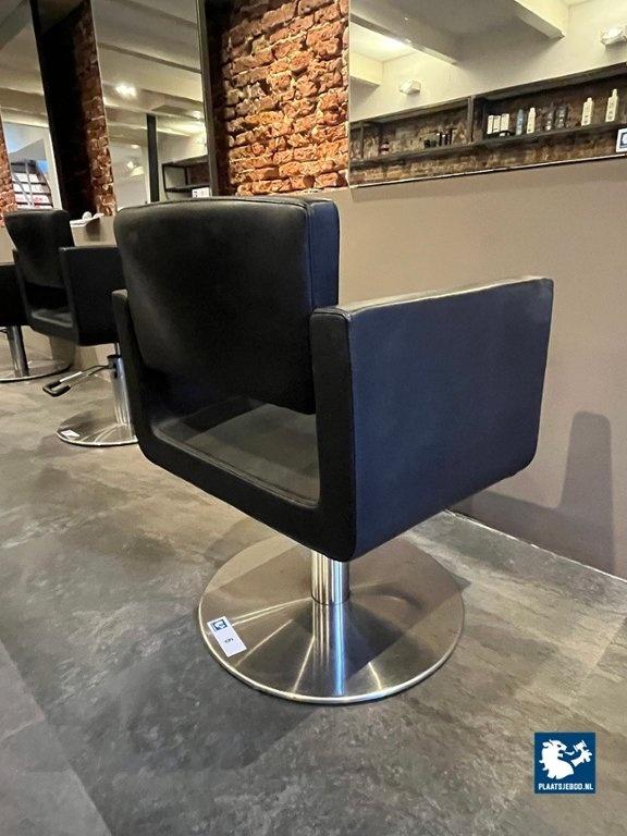 1 x Kapperstoel, kubusachtig ontwerp, zwart leer, in hoogte verstelbaar, met gasveer, chroom ronde voet