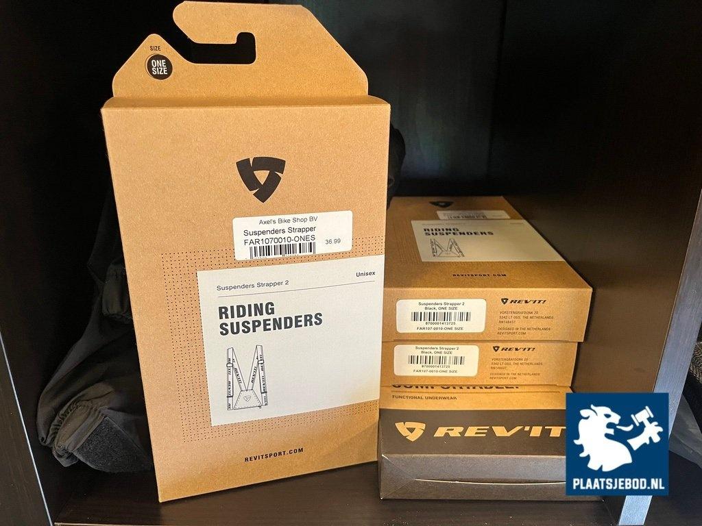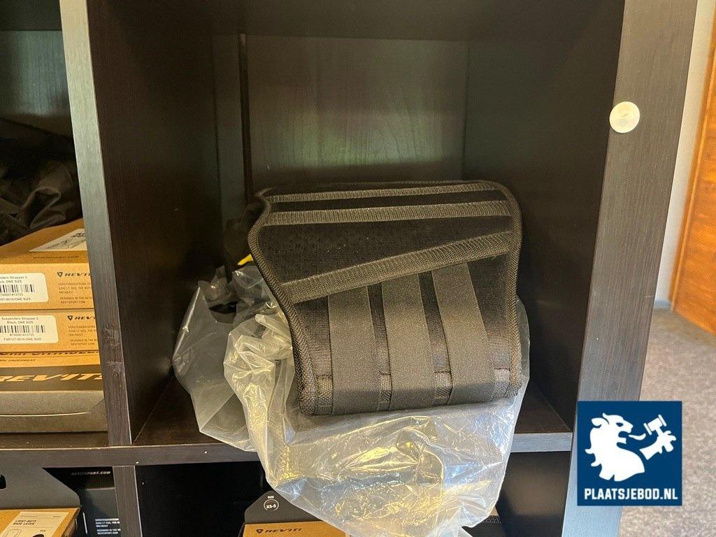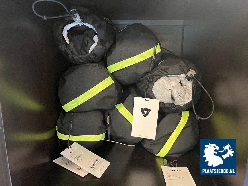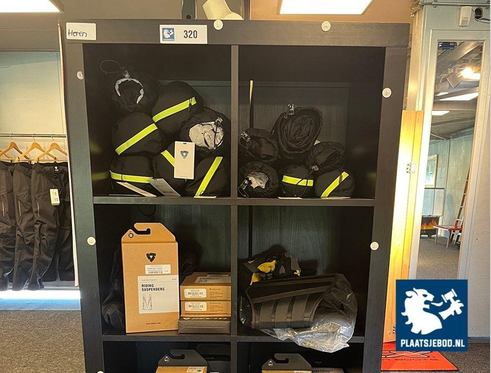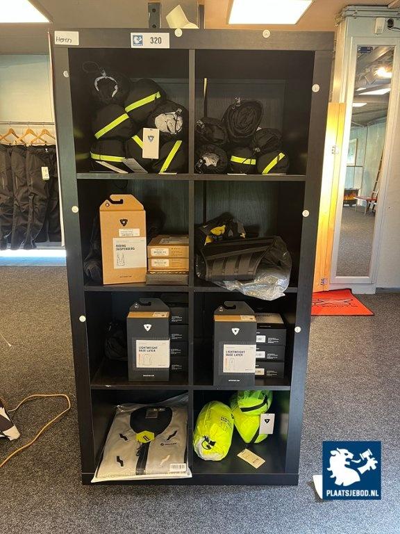 1 x Kast met oa regenbroeken, riding suspenders, niergordels, basis layers (boven en onder), koelvesten (kavel is incl vakkenkast)