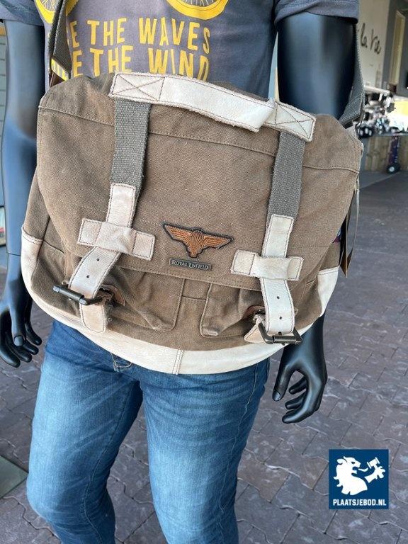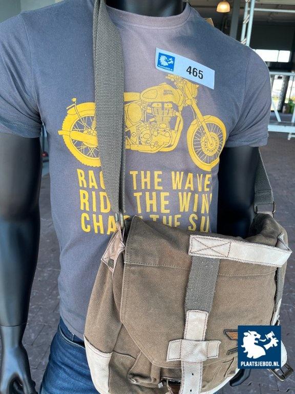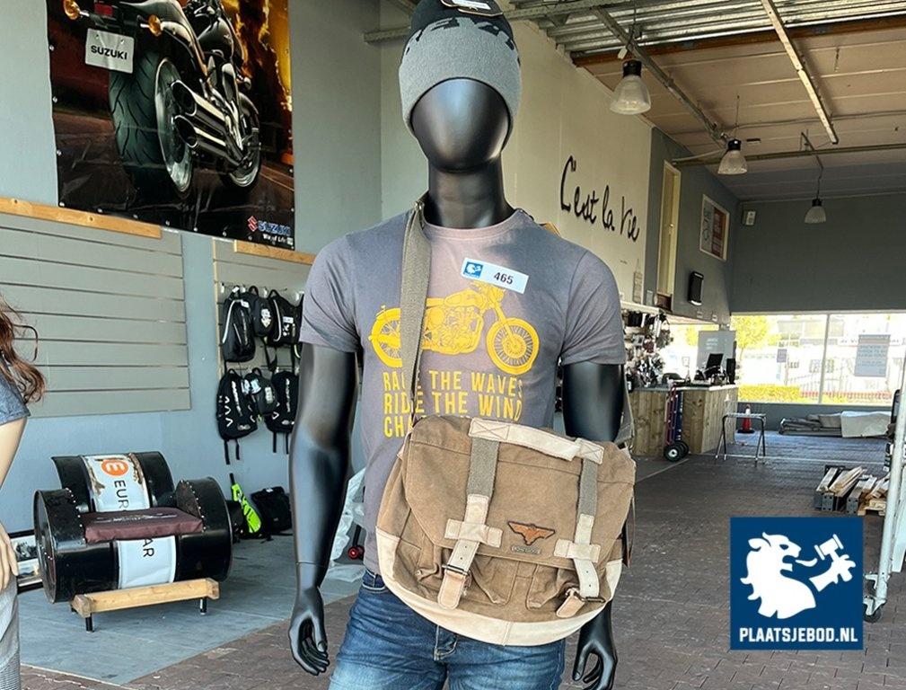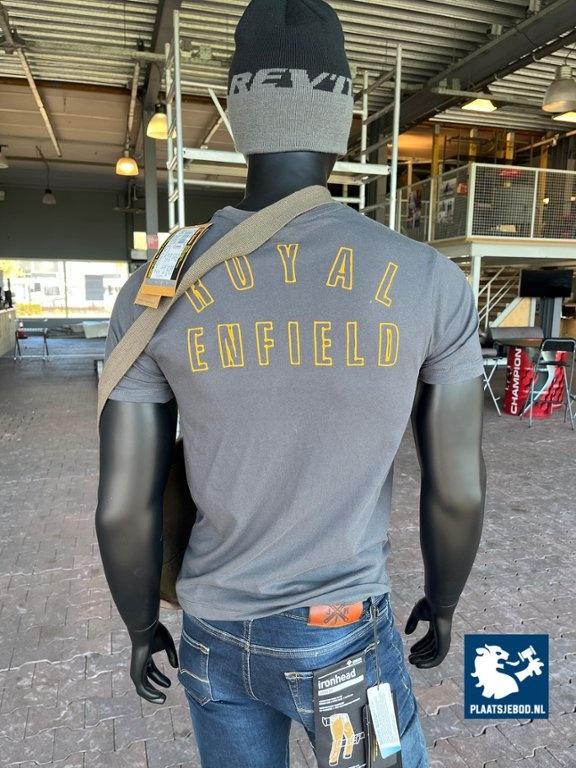 1 x Kledingset met paspop Raphael: t-shirt Royal Enfield, Canvas shoudertas Royal Enfield, jeans IronHead, REV'IT! beanie