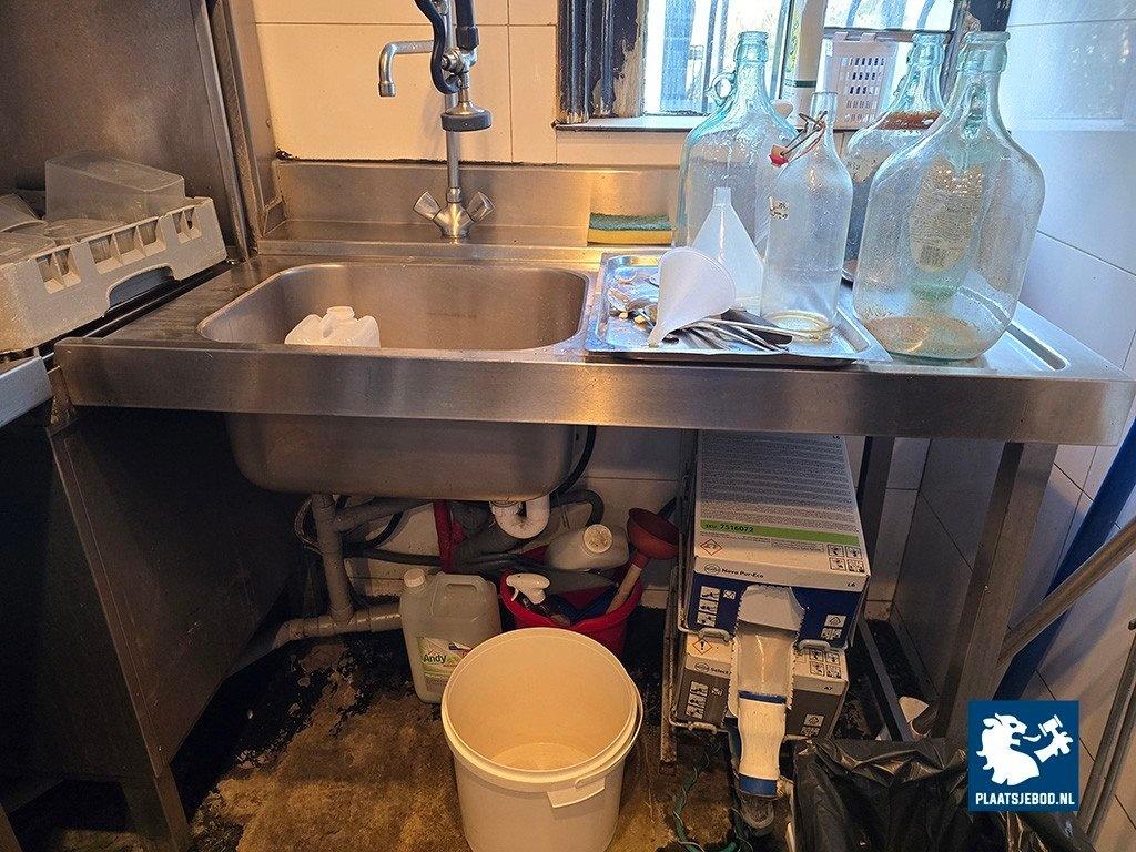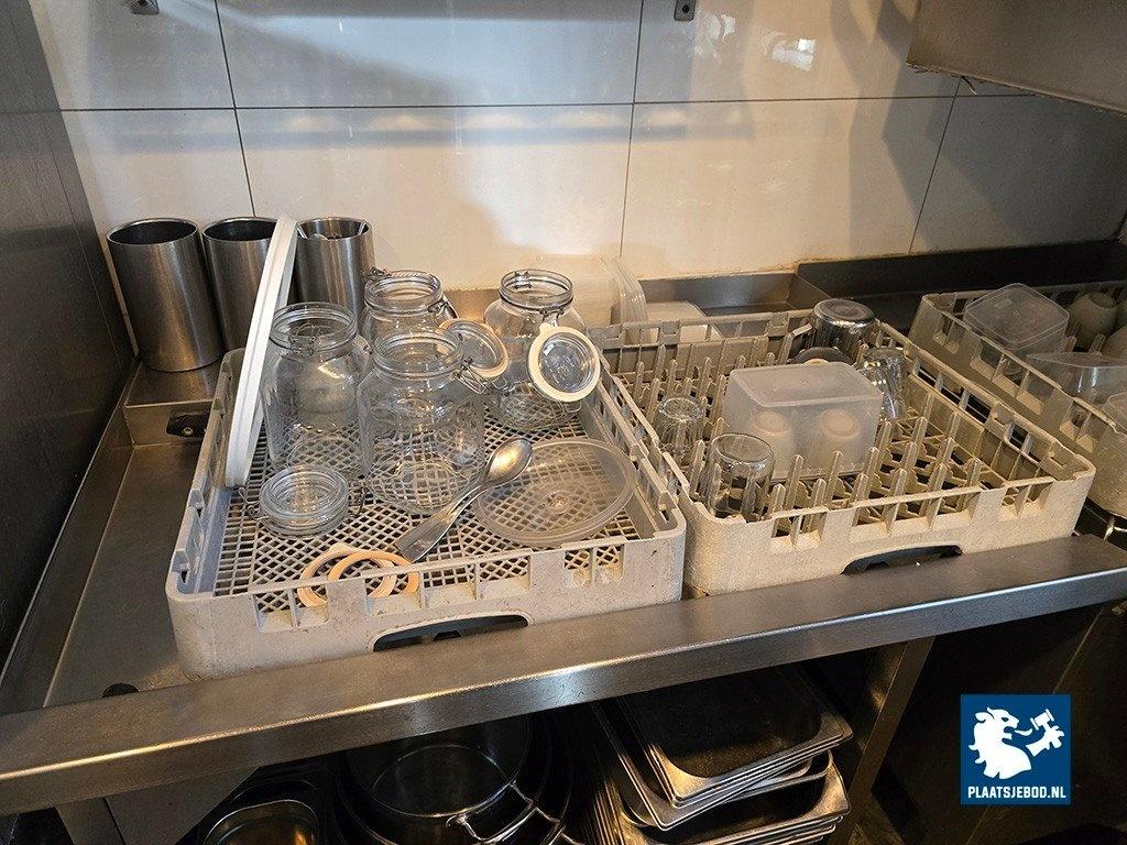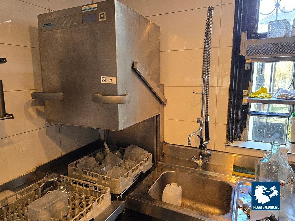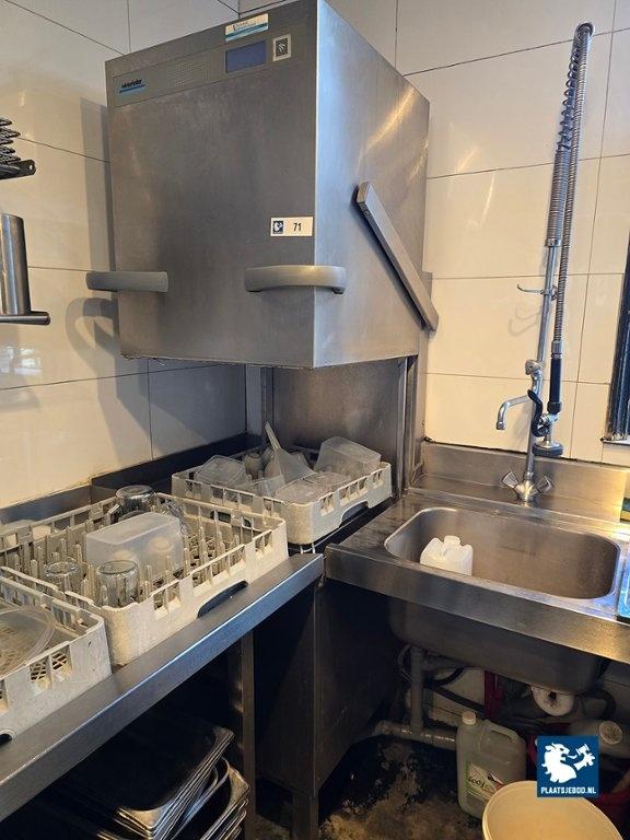 1 x Winterhalter hoekopgestelde doorloop korvenvaatwasser met aan- en afvoertafel, wasbak met handdouche, zeepdosseerpompen en kunststof korven. LET OP: koper dient zelf de waterleiding kundig af te doppen.