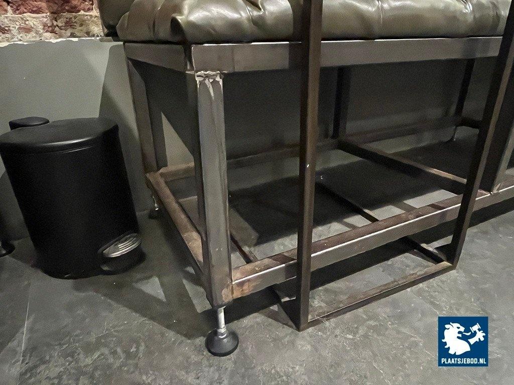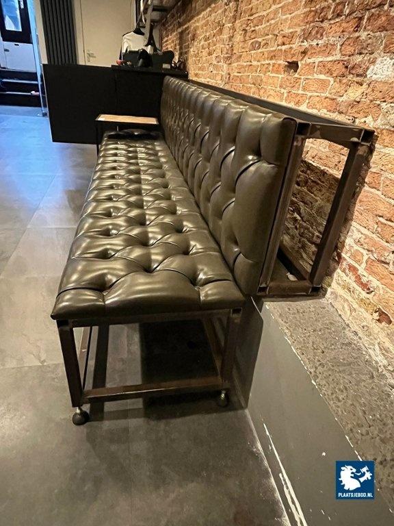 1 x Lederen zitbank van gecapitonneerd groen leer. Op stalen frame. Formaat 240 x 50 cm. 1 x Tafeltje. Leuning van de bank zit vast (kan voorzichting gedomnteerd worden)