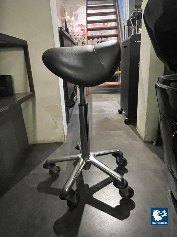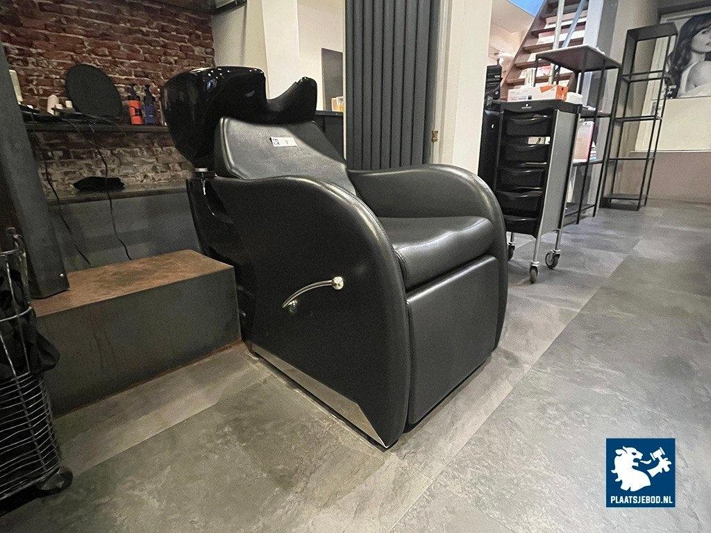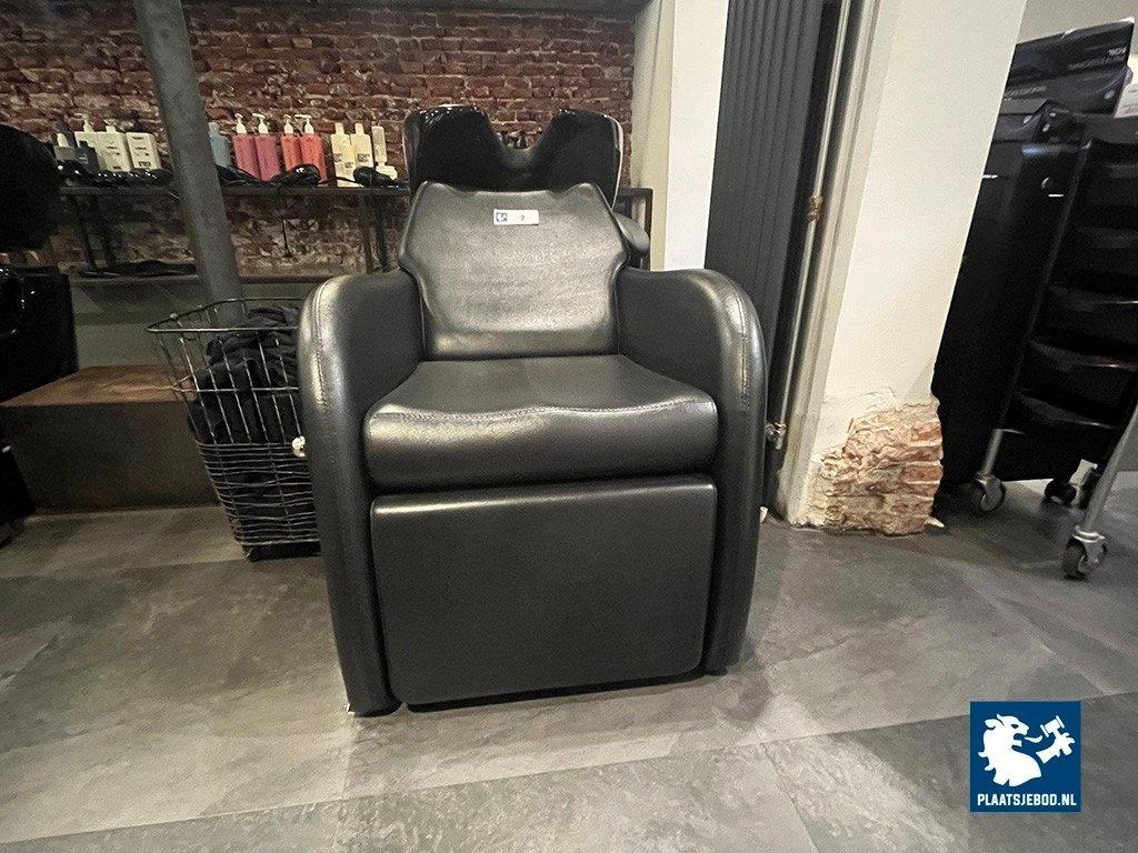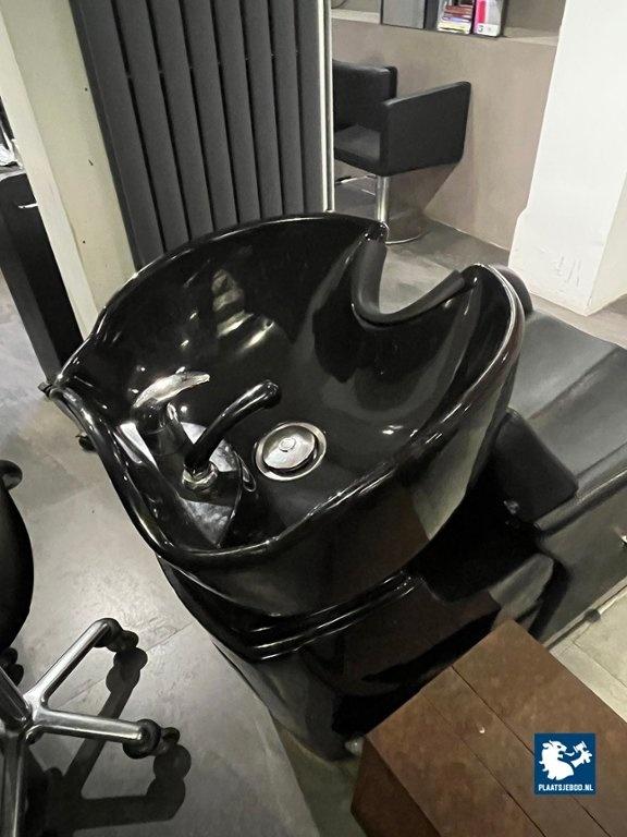 1 x Luxe wasunit voor kappers, zwart design, met spoelbak en mengkraan. 1 x rijdbare zadelkruk. LET OP: De koper verplicht zich de aan- en afvoerleidingen op een deugedelijke manier af te doppen.
