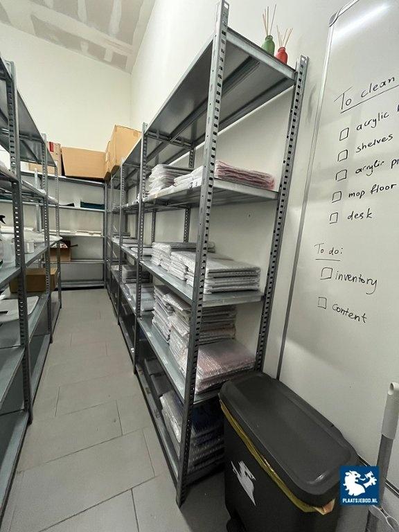 1 x Magazijnstelling in 6 secties, elke sectie met vijf leggers, formaat 100 × 200 cm, totaal 600 cm stellingkast. Zonder inhoud.