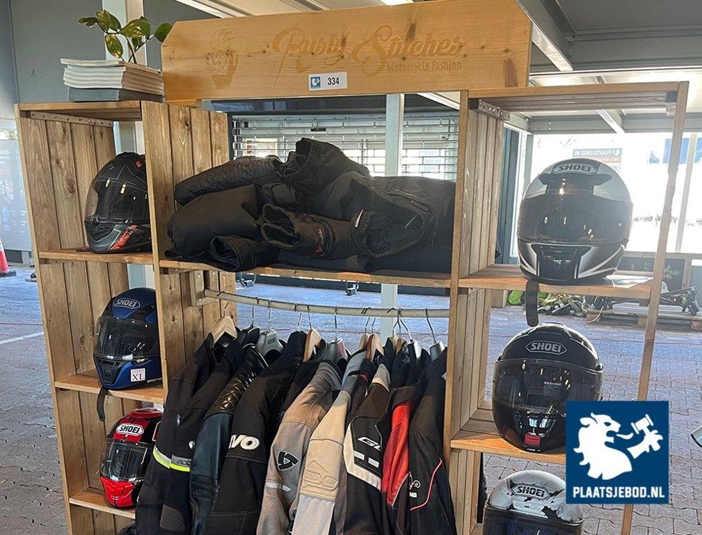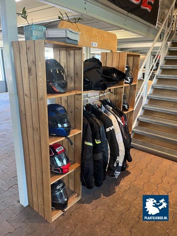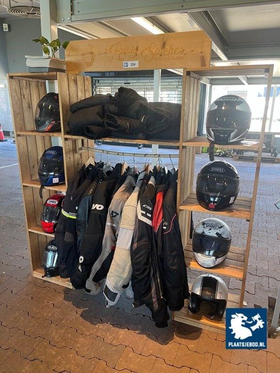 1 x Meubel met motorhelmen en motorjassen en -broeken, diverse maten en soorten