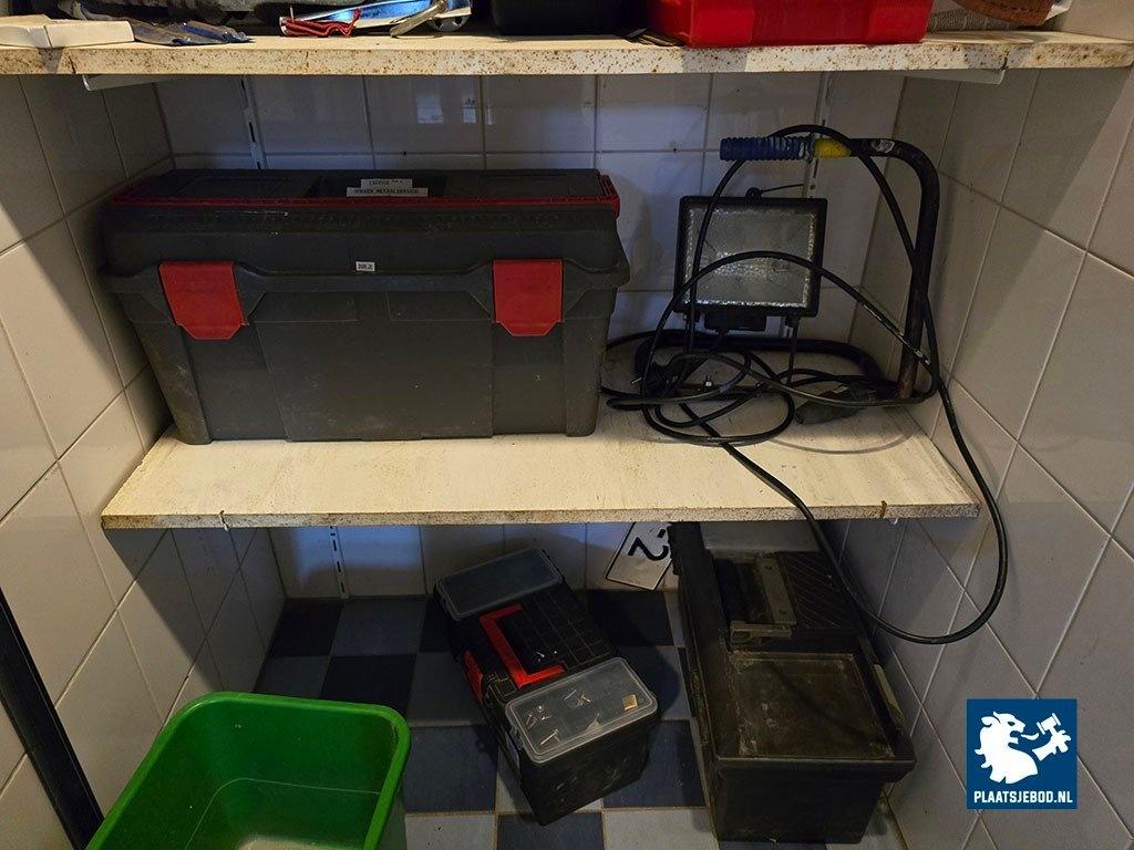 1 x Partij divers gereedschap in kast waaronder gereedschapkisten, karweibrander, oplader, LED lamp, etc.