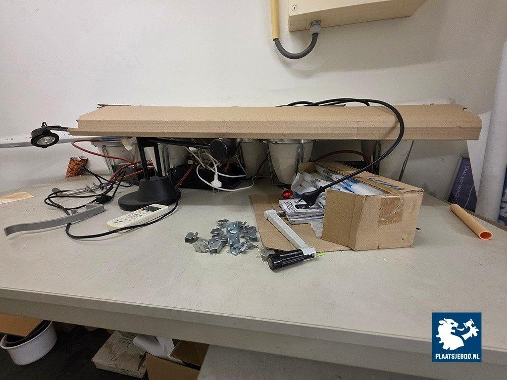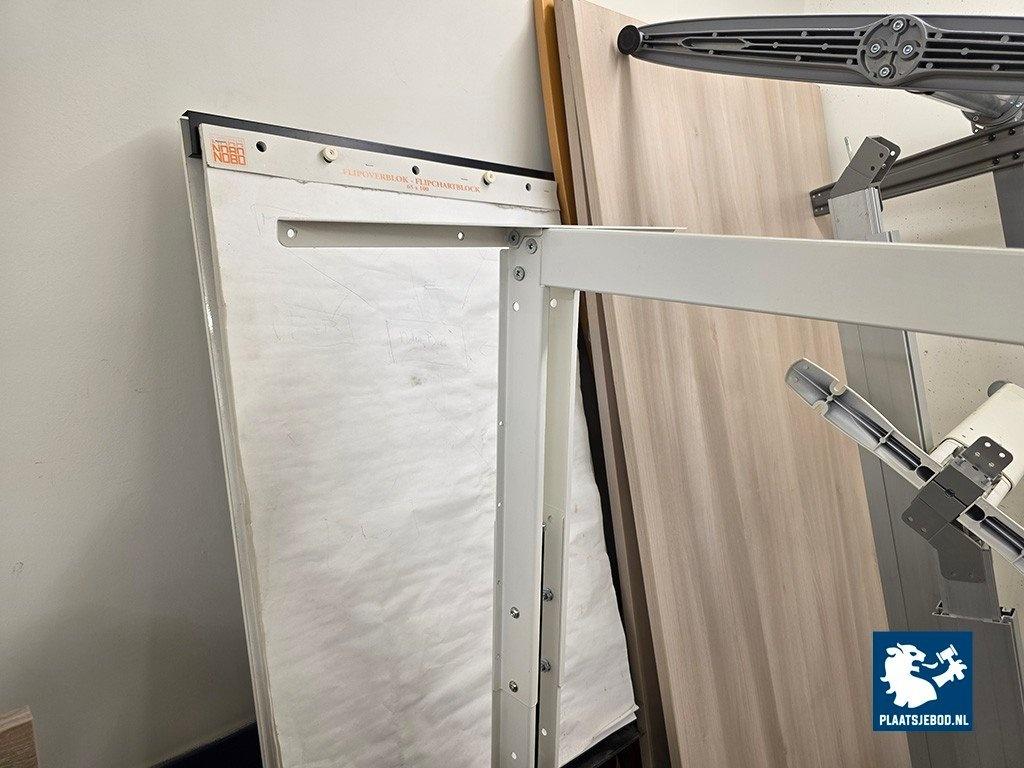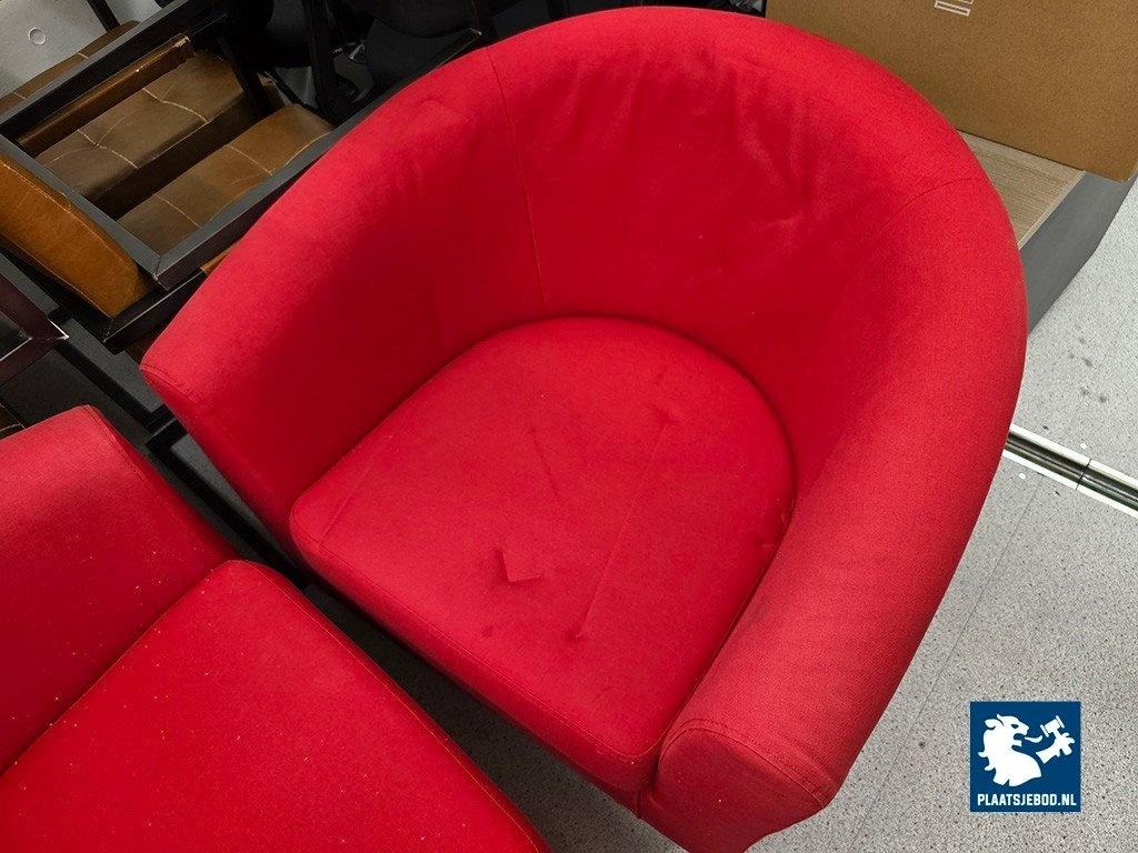 1 x Partij diverse kantoorinventaris waaronder rode fauteuils, ca. 200 cm. Roll-up banner systeem, diverse (elektrische) bureaus ca. 200 x 100 cm, 2 x ladekast, bordestrap, etc.