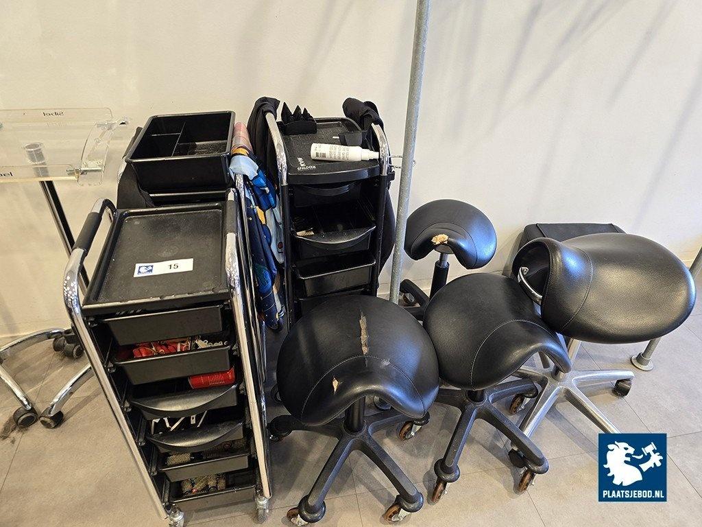 1 x Partij diverse kapperstrolley's en in hoogte verstelbare zadelkrukken