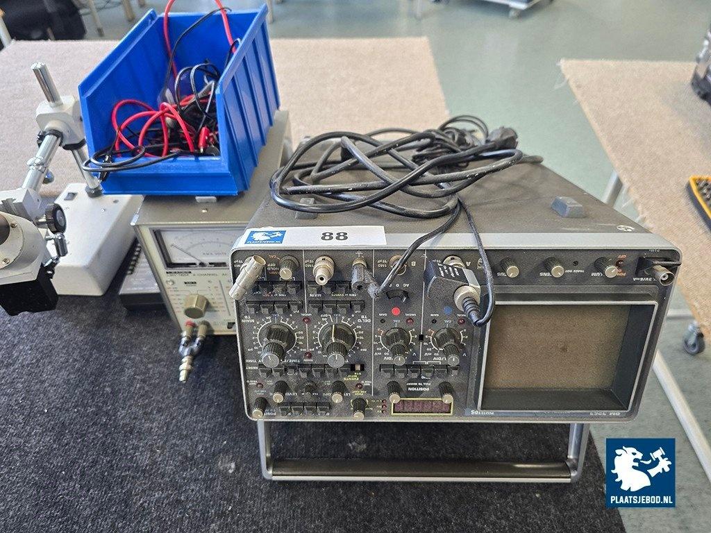 1 x Partij diverse meet/ testapparatuur waaronder Philips PM3263 analoge oscilloscoop, industriële microscoop en 2-kanaals AC-millivoltmeter.