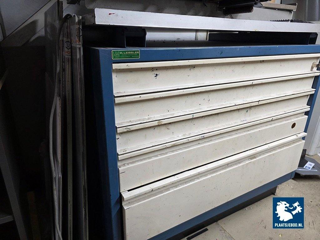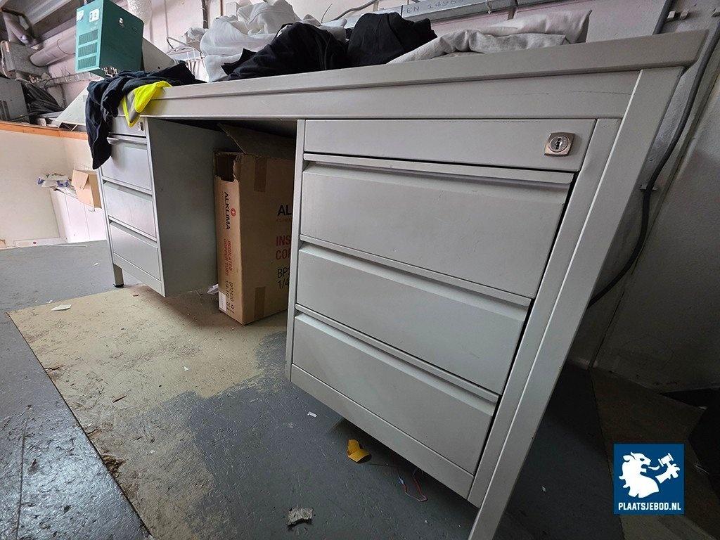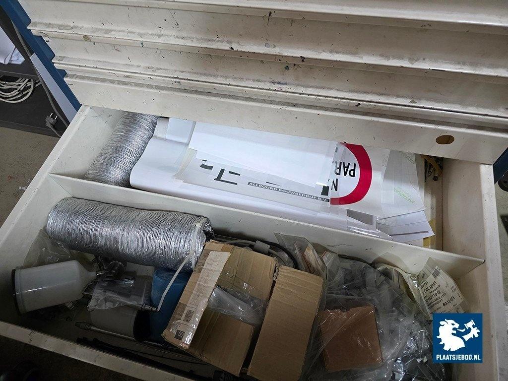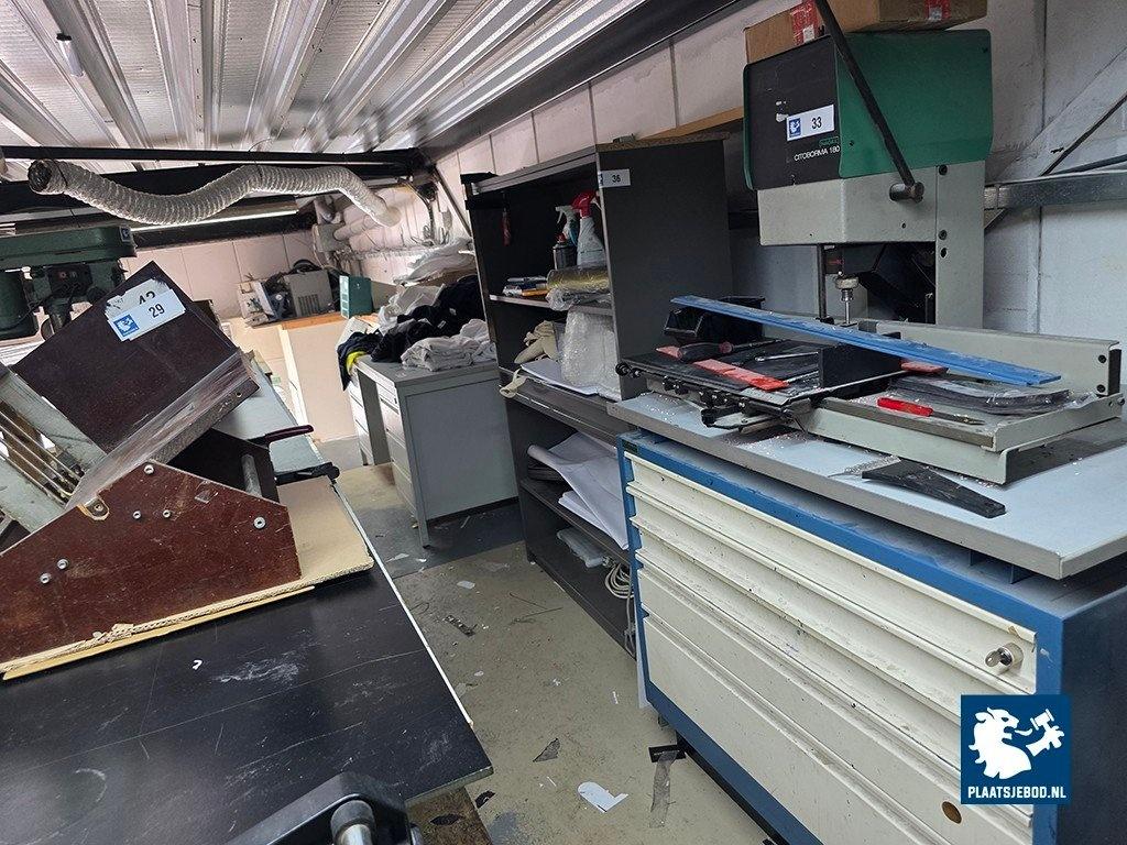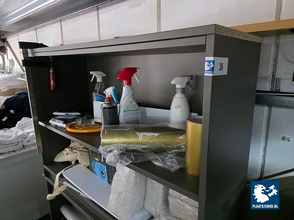 1 x Kast met inhoud, 1 x stalen bureau, 1 x brede ladekast, 1 x in hoogte verstelbare witte kruk en werktafels op entresol