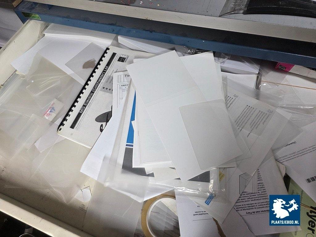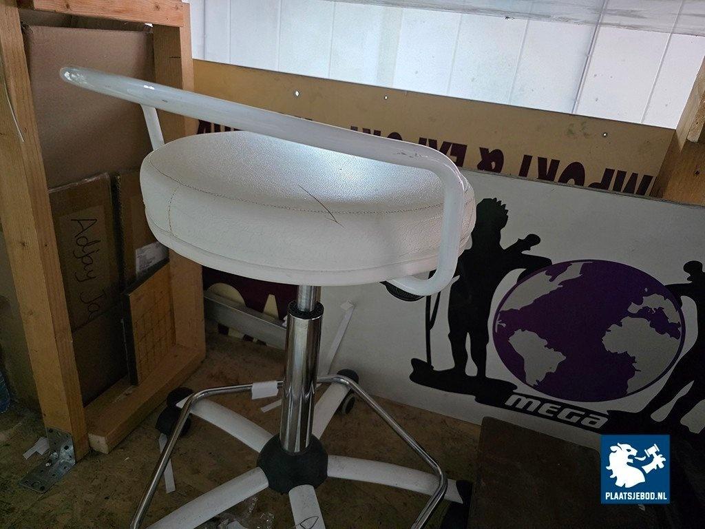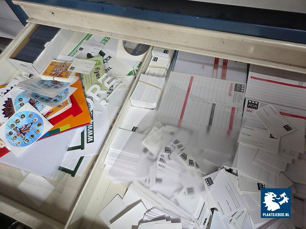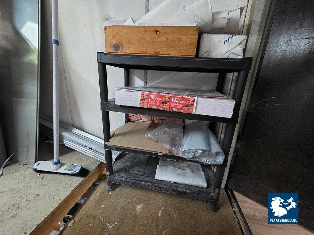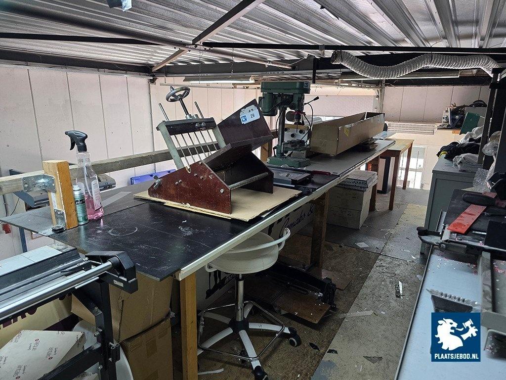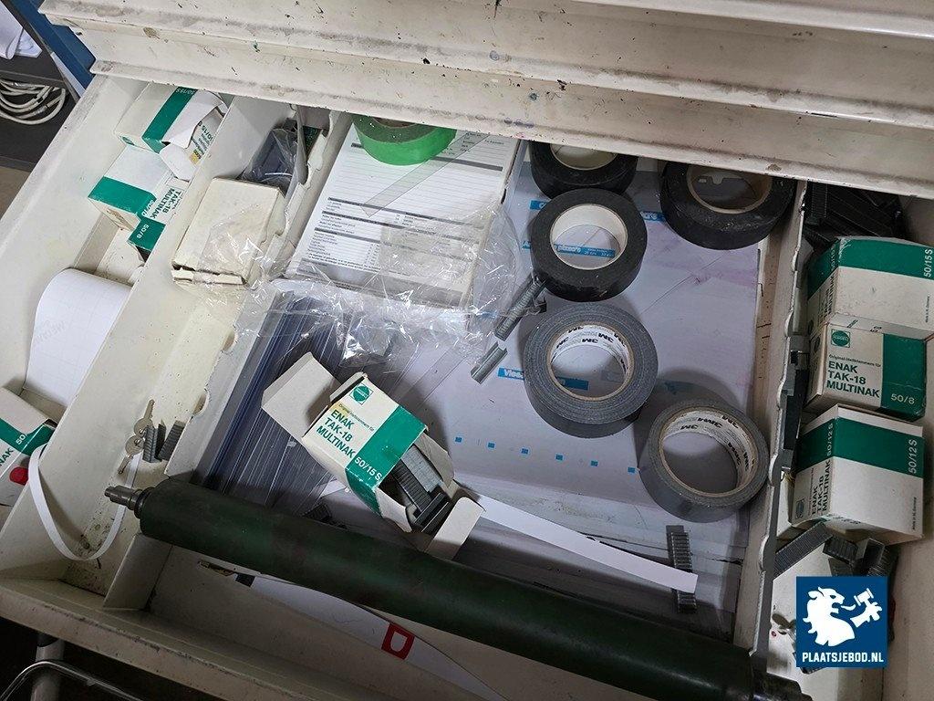 1 x Kast met inhoud, 1 x stalen bureau, 1 x brede ladekast, 1 x in hoogte verstelbare witte kruk en werktafels op entresol