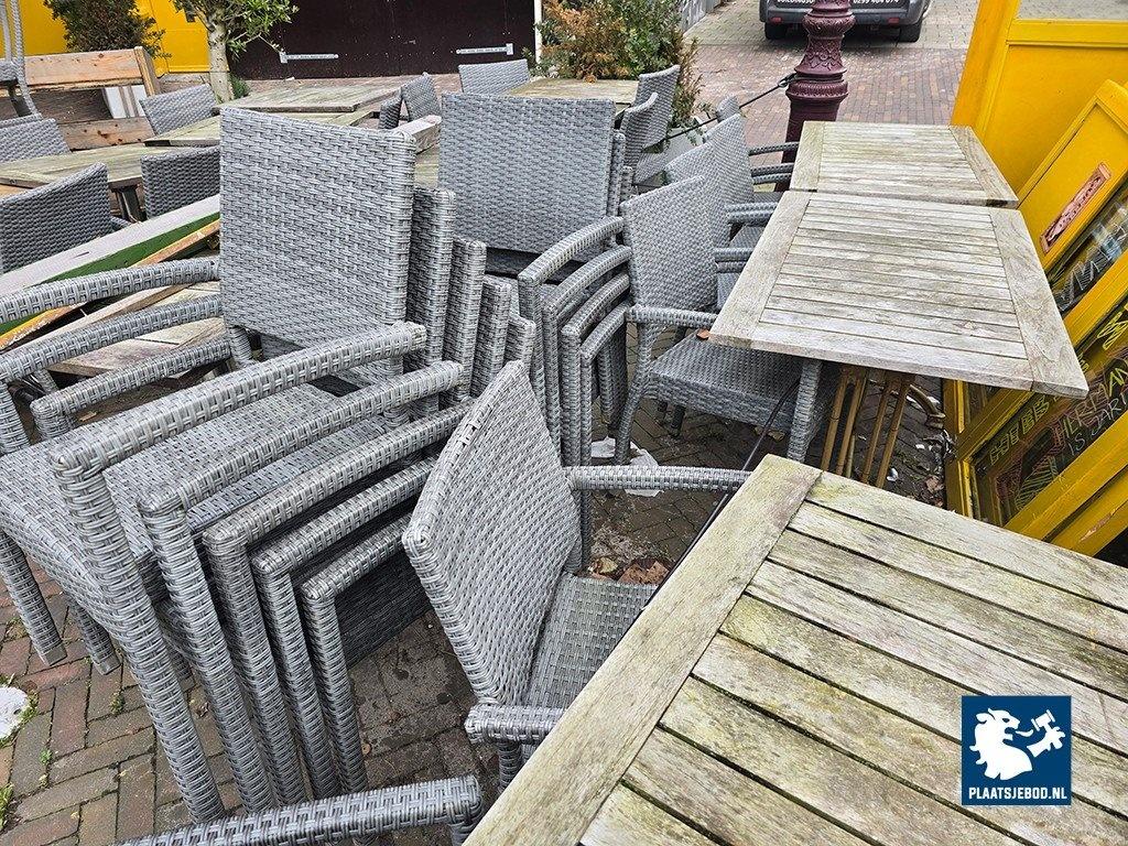 1 x Partij diverse tafels ca. 18 stuks en Wicker stapelbare terrasstoelen ca. 38 stuks