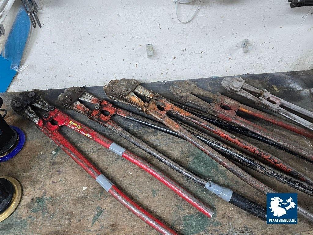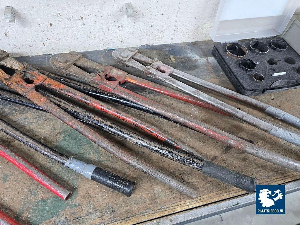 1 x Partij handgereedschap op werkbank waaronder diverse betonscharen, gatenboren, AEG ST1700, etc.