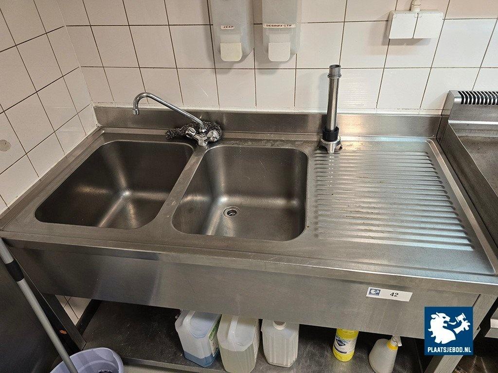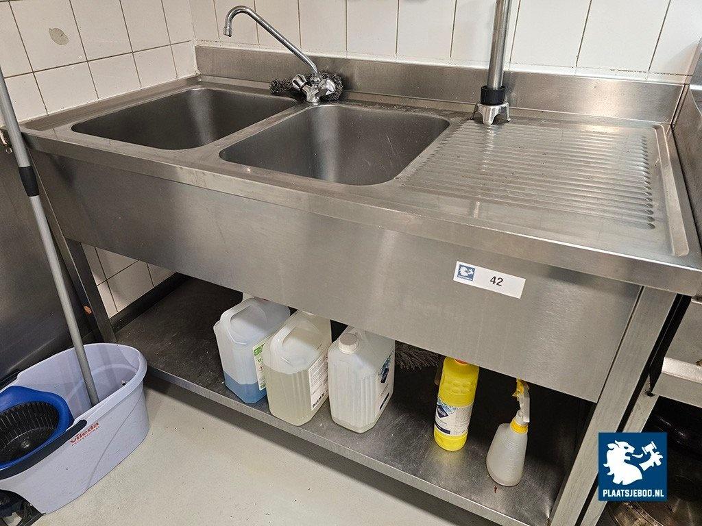 1 x RVS wastafel met dubbelespoelbak en mengkraan, afm. 140 x 70 cm.(let op: de koper verplicht zich om alle aan- en afvoerleidingen proffessioneel af te doppen)