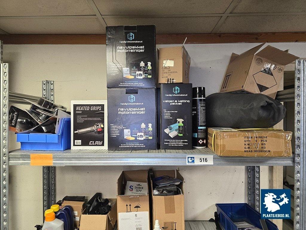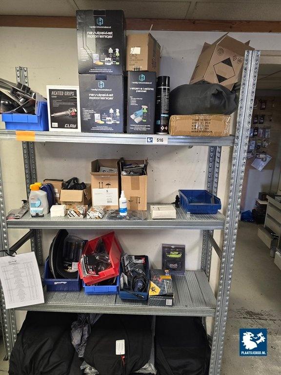 Kavel 328-516: 1 x Sectie magazijnstelling en wandbord met diverse motoronderdelen
