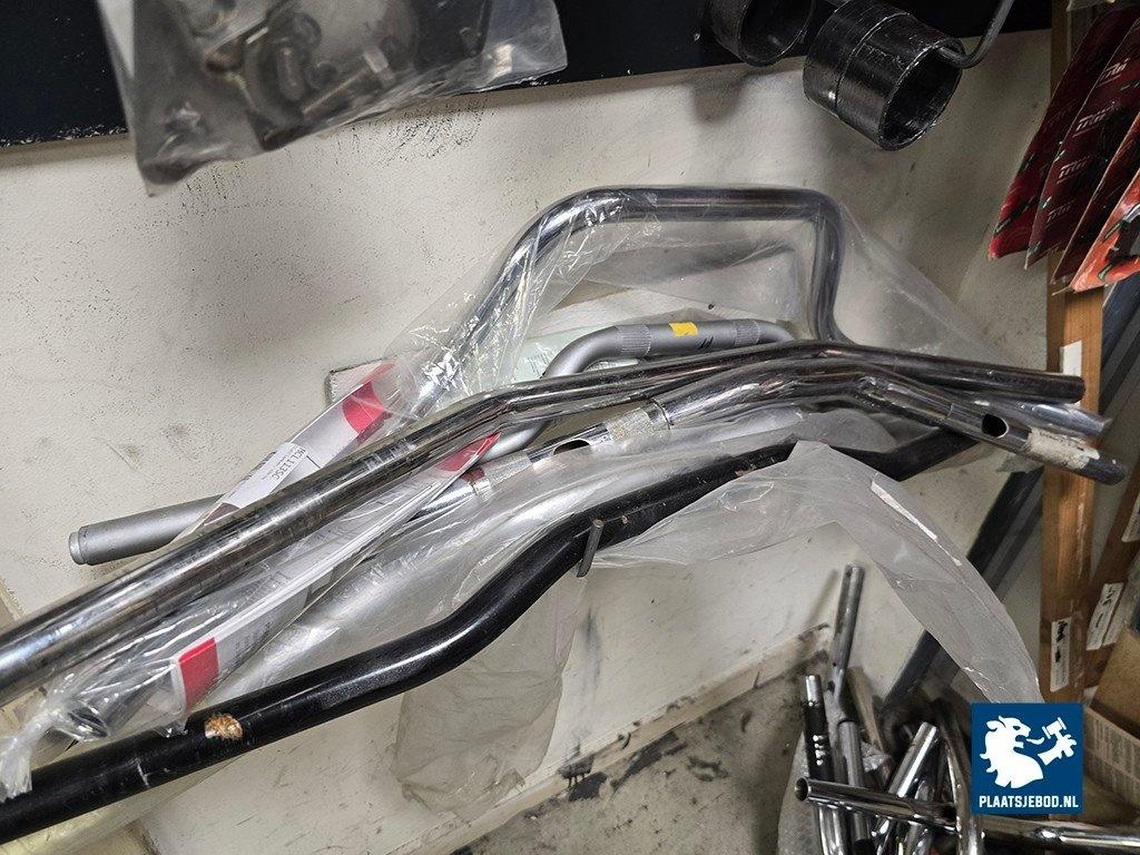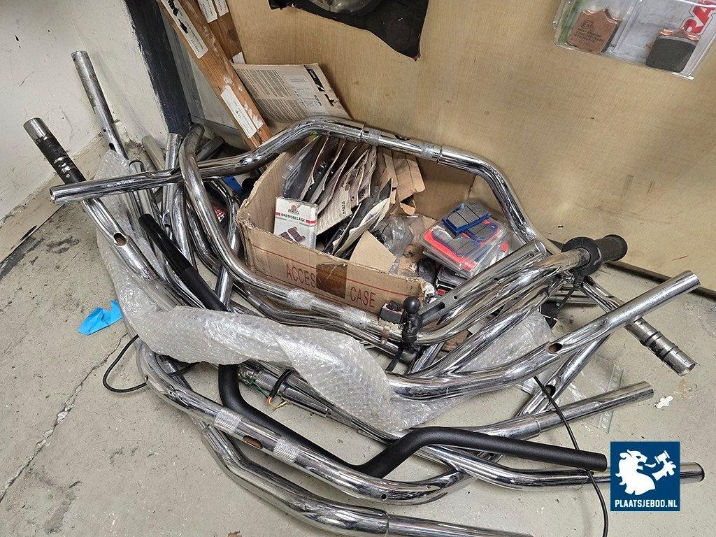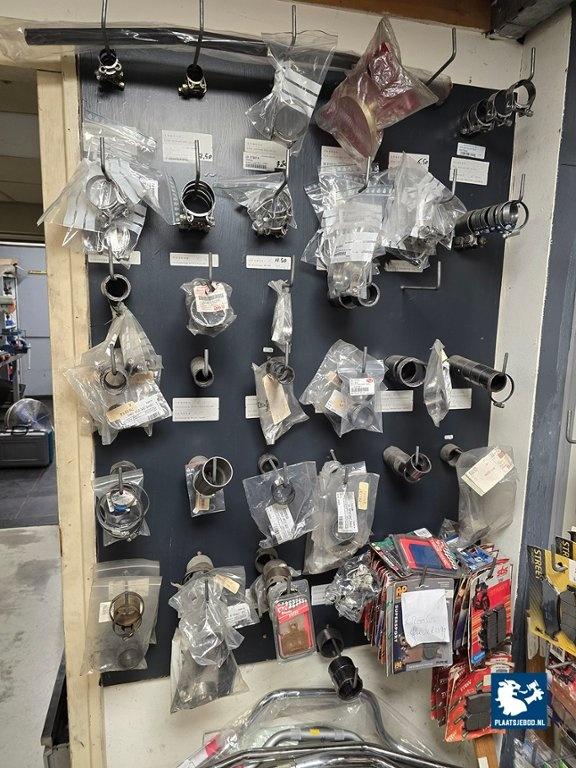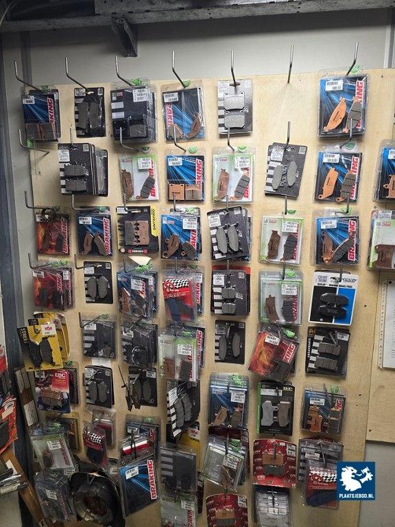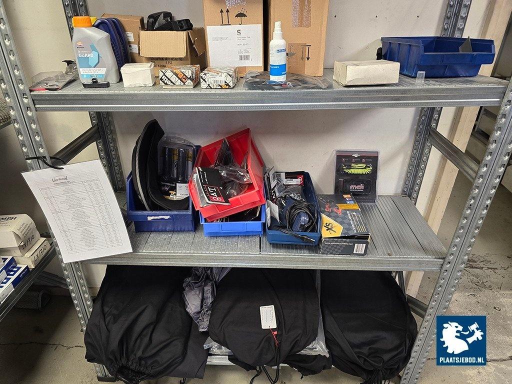 1 x Sectie magazijnstelling en wandbord met diverse motoronderdelen, motorhoezen, remblokken, uitlaatonderdelen, sturen, etc.