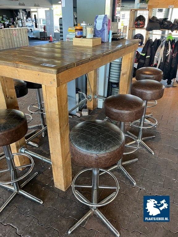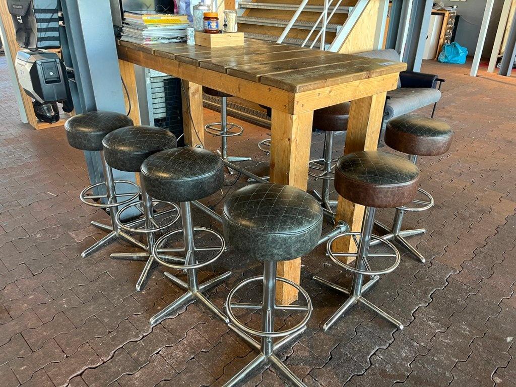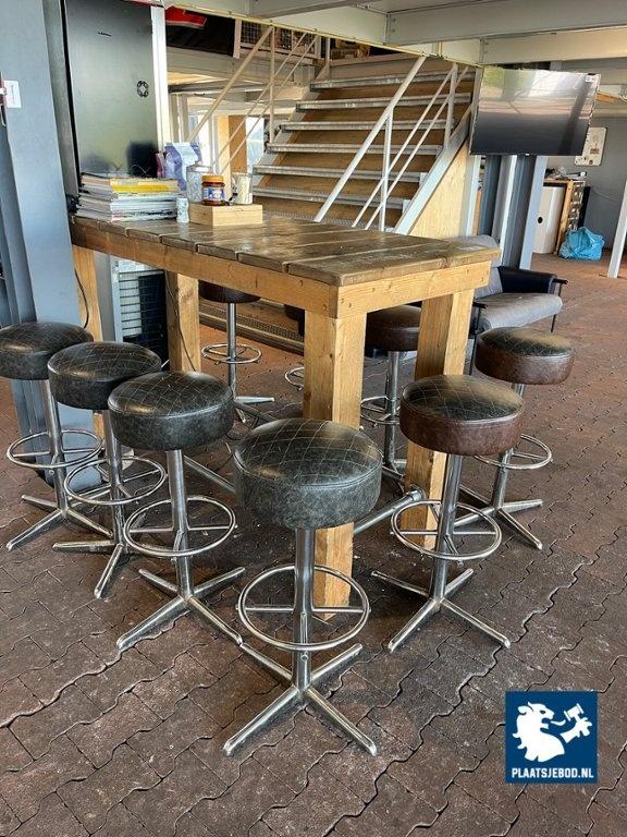 1 x Sta/zithoek met houten tafel en 9 barkrukken
