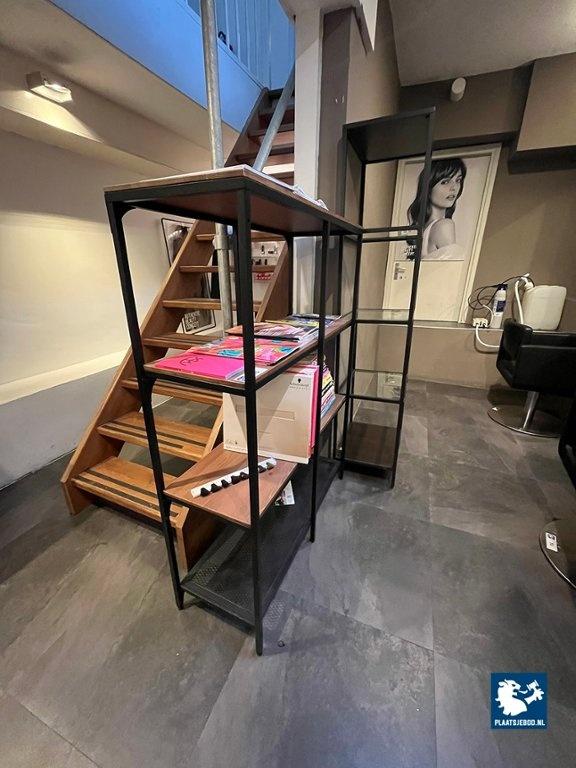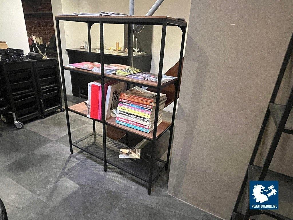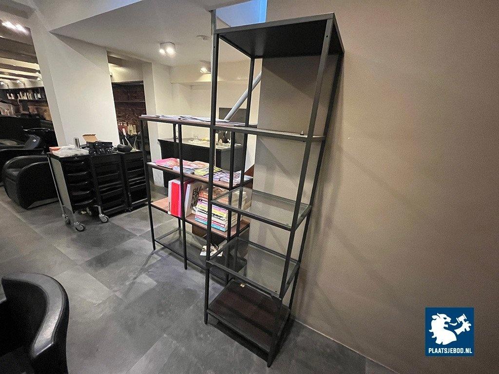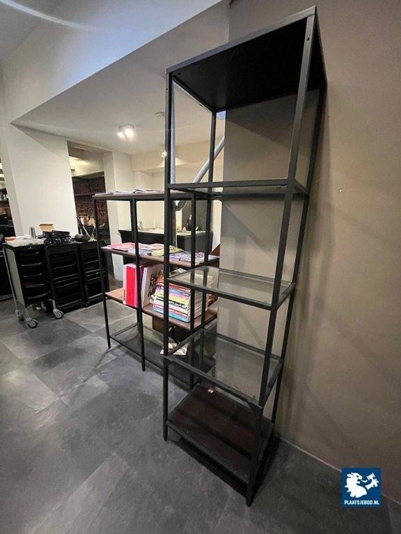 1 x Stellingkast met stalen frame, houten planken, kleur zwart, formaat 100x140x35cm. 1 x stellingkast met een zwart frame en glazen planken, formaat 175x50x36cm