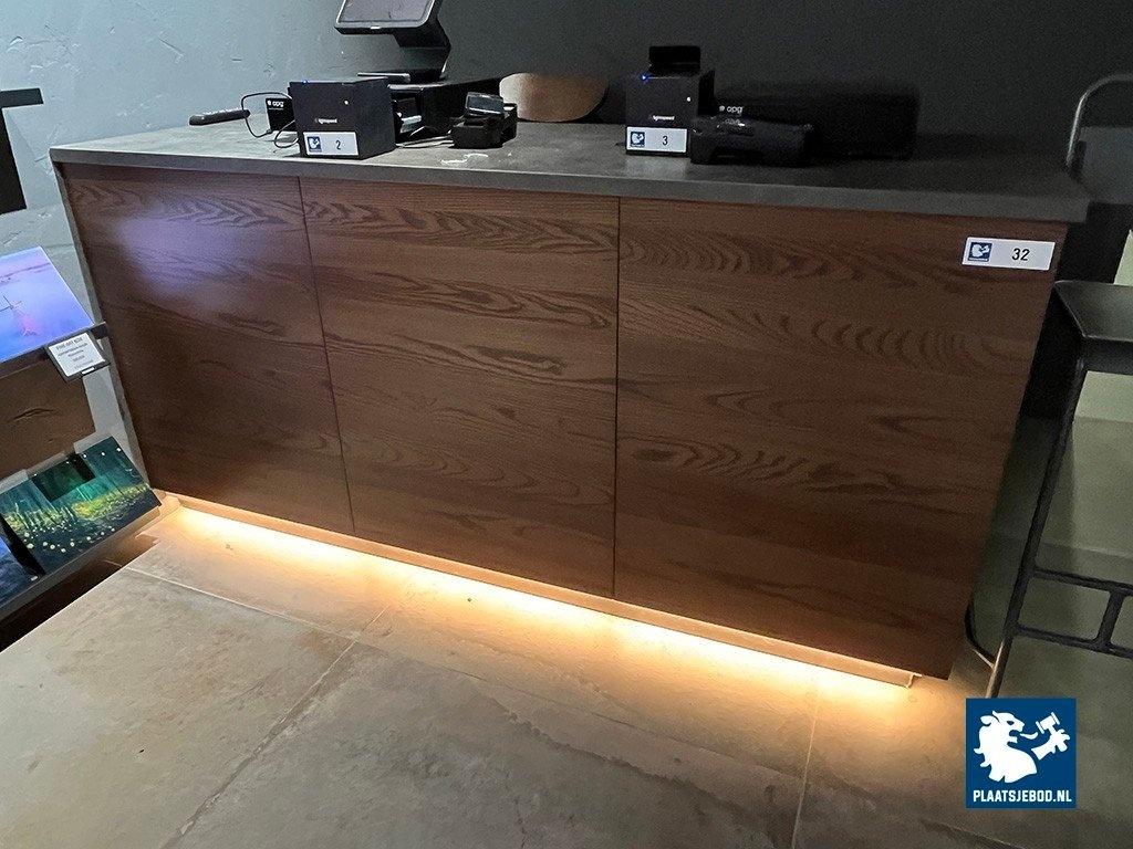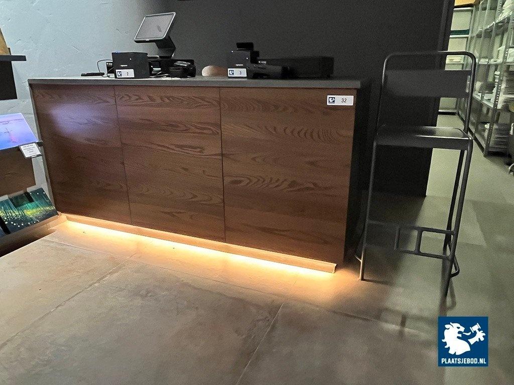 Kavel 298-032: 1 x Verkoopbalie, met LED-verlichting, diverse lades en plankjes, donkerbruin, houtfineer, formaat 260 x 90 cm