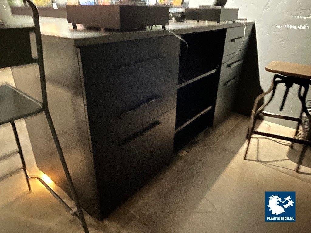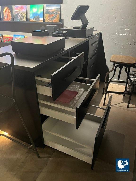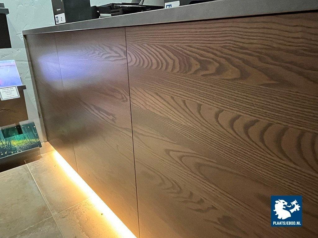 1 x Verkoopbalie, met LED-verlichting, diverse lades en plankjes, donkerbruin, houtfineer, formaat 260 x 90 cm