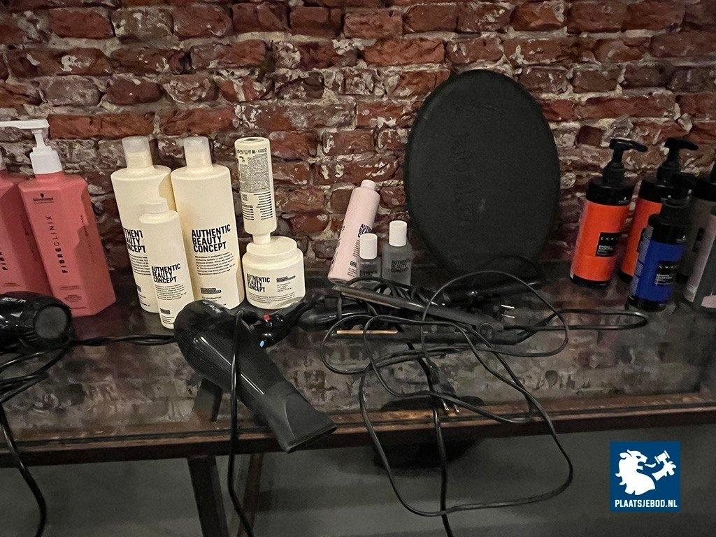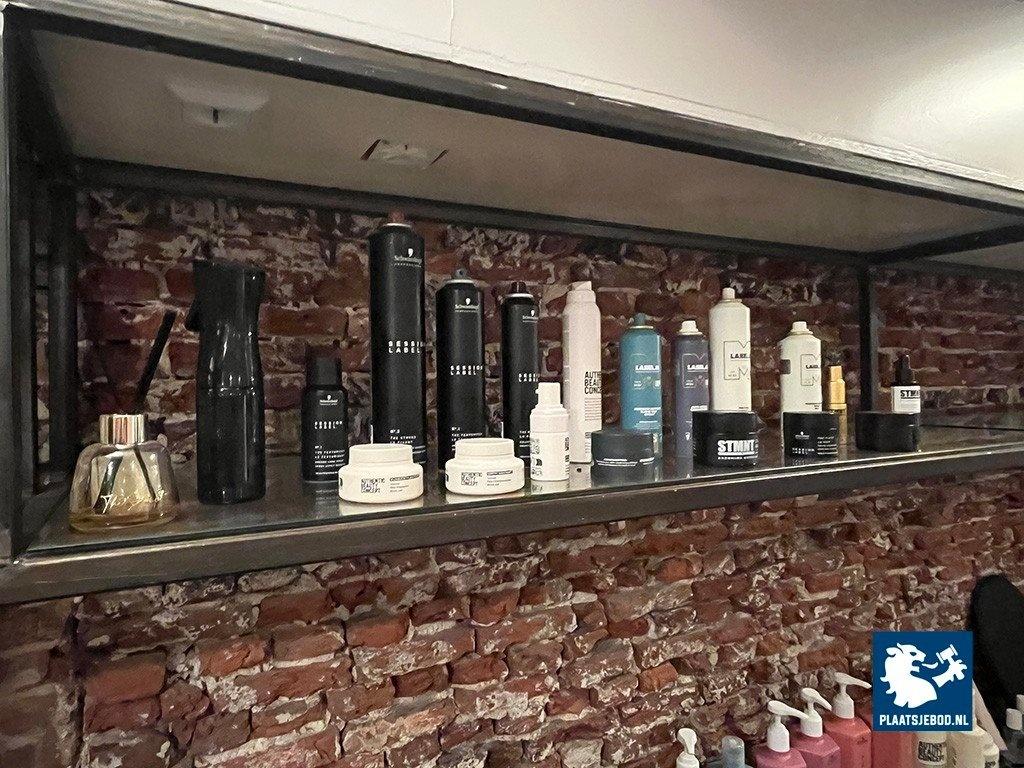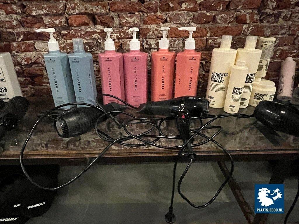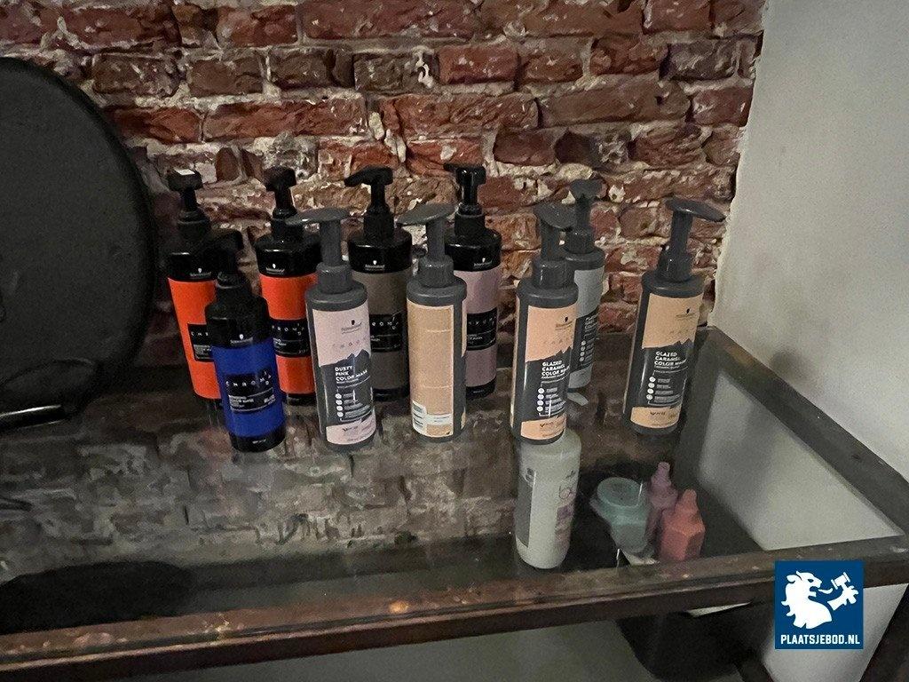 1 x Wandkast met voorraad shampoo, gel, diverse föhns, etc