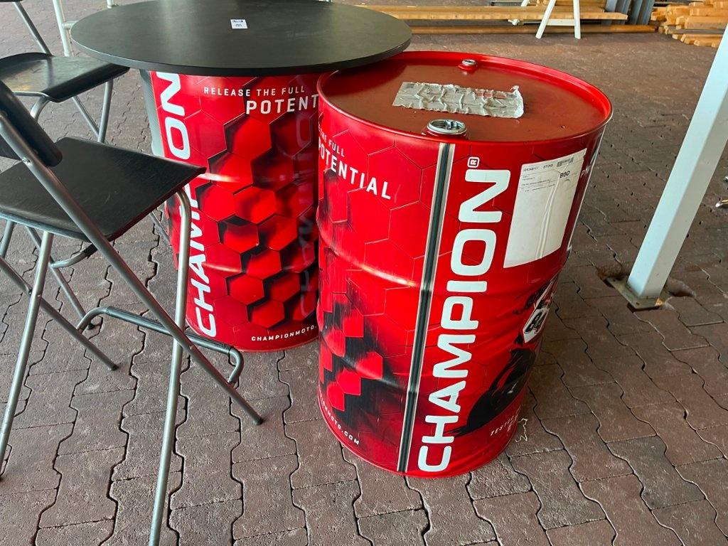Kavel 337-466: 1 x Zithoek met tafel op olievat, 2 x barkruk, 1 x los olievat