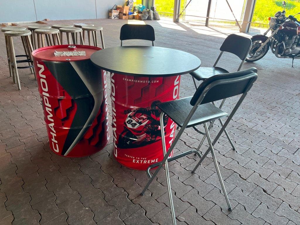 1 x Zithoek met tafel op olievat, 2 x barkruk, 1 x los olievat