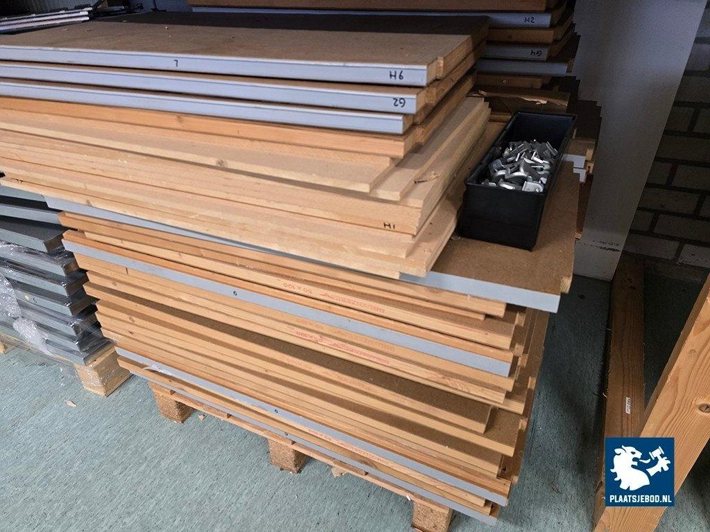 12 x Sectie houten legbordstelling ca. 100 x 50 x 212 cm en pallet legborden